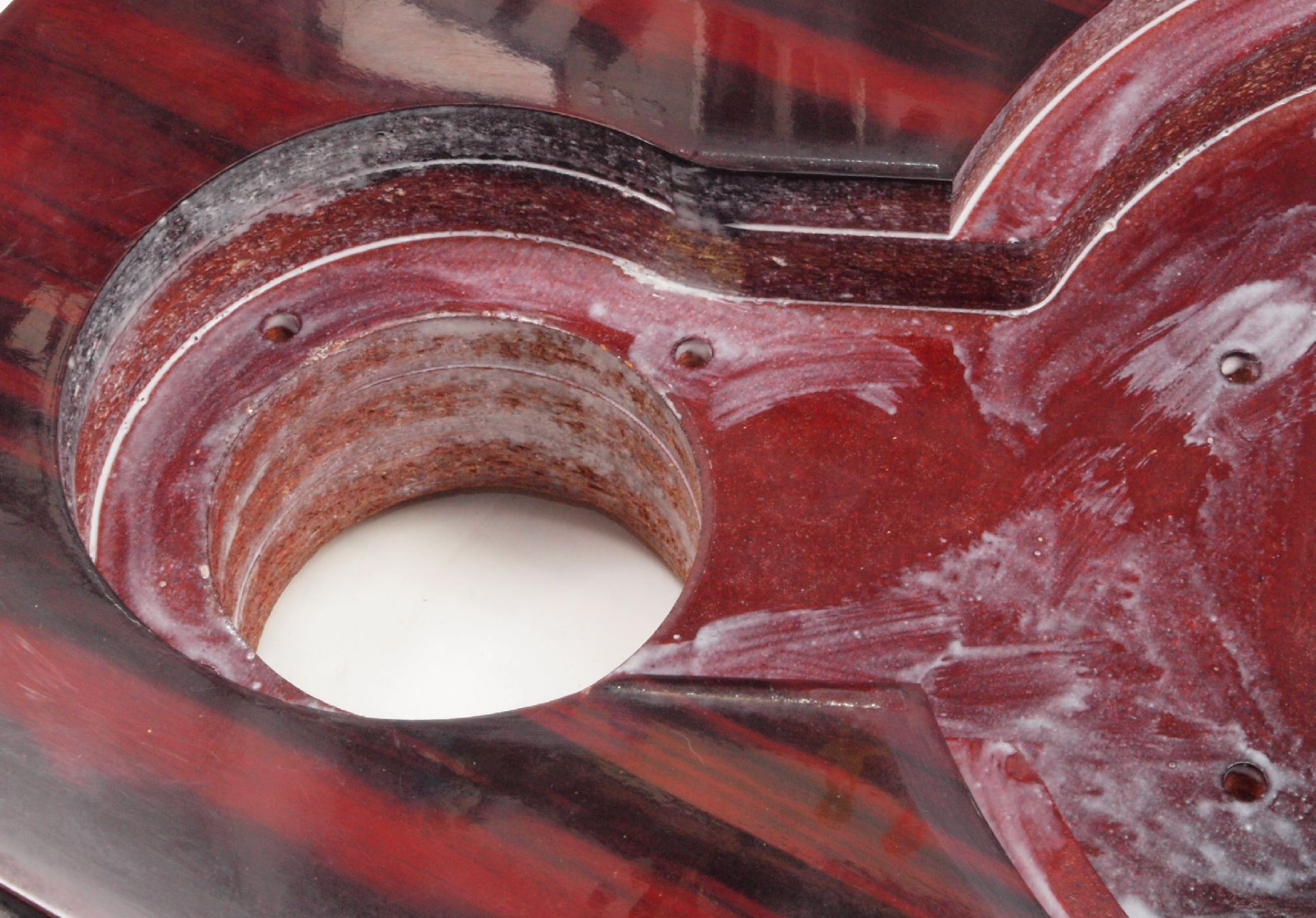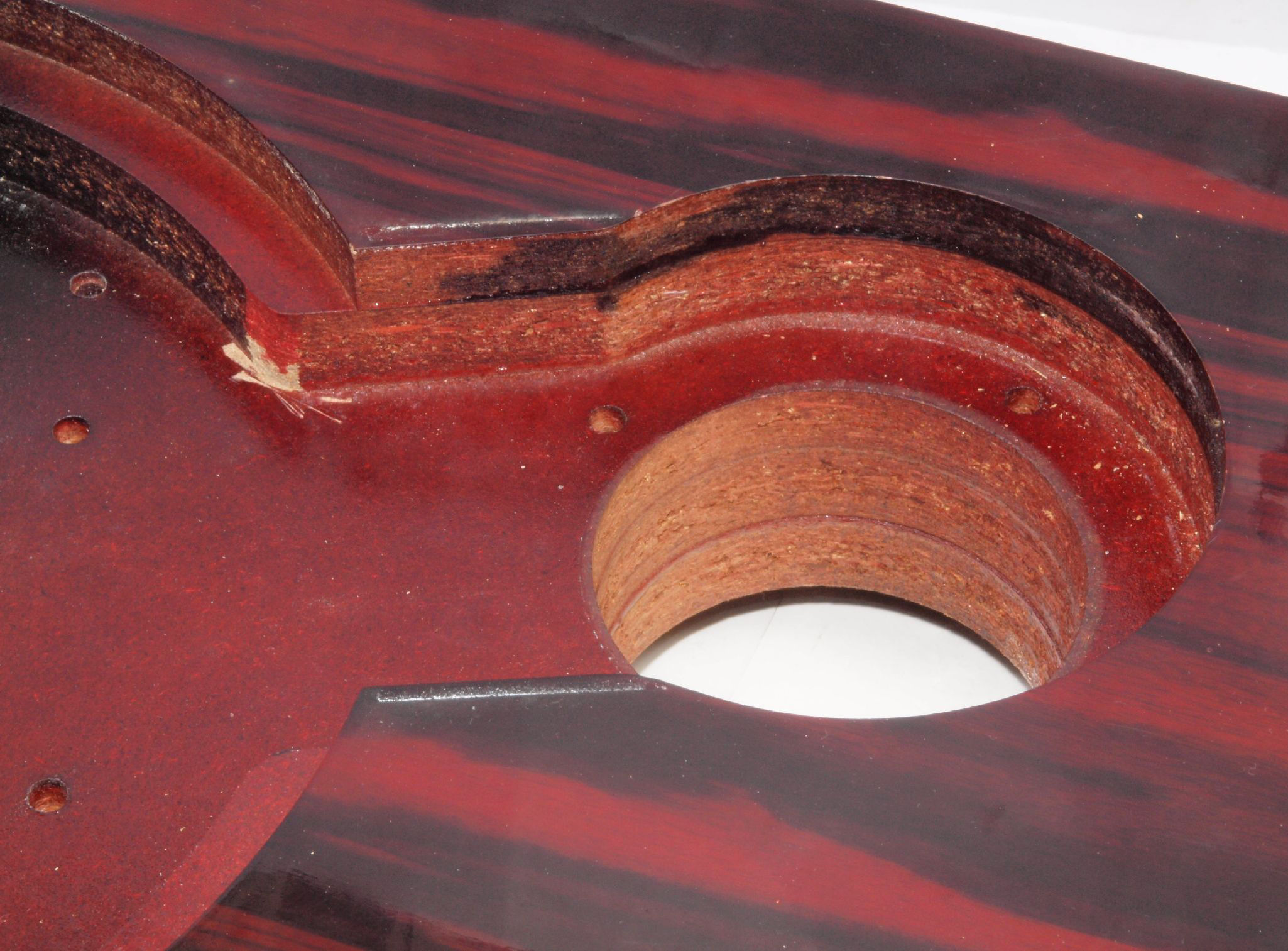 | W7B. 修理中 下蓋のトランスカバー取り付穴、反対側。ボンドを染みこませる、ネジ穴も塗る。 | ||||||||||||||||||||||||