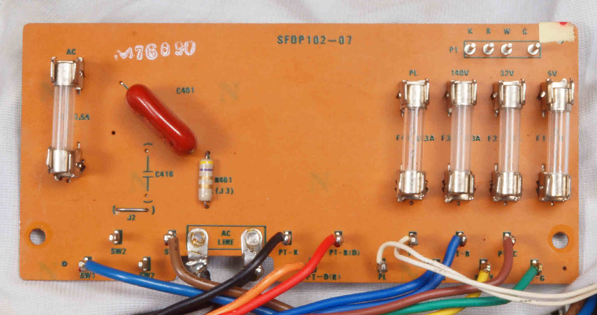 C23. 修理(半田補正)後 電源ヒューズ基板裏。全ハンダをやり直す。