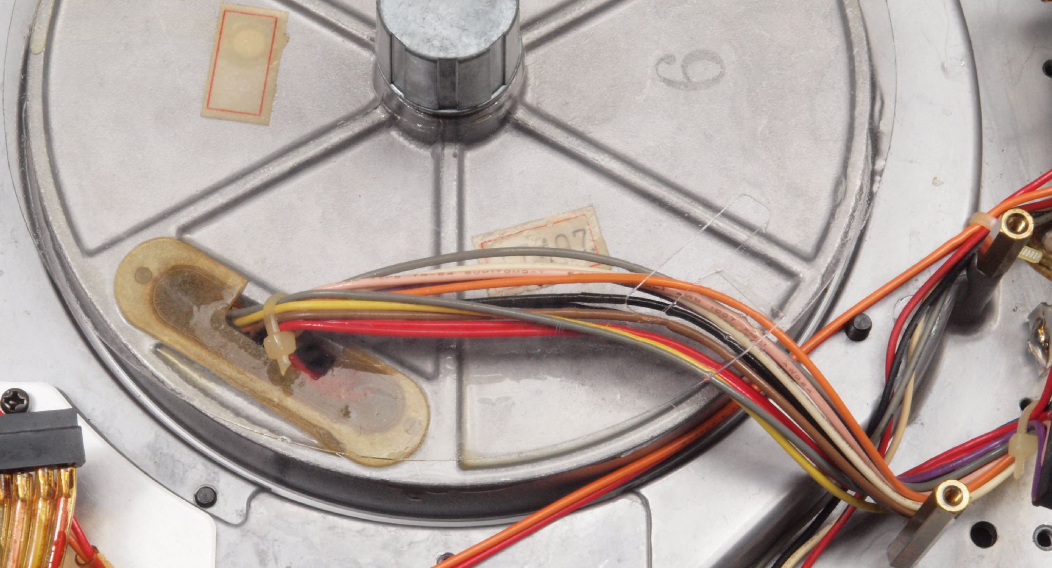| M02. 修理中 モータを下から見る。押さえシートの中はオイルでベッタベタ! 引き出し線もオイルが一杯付着! | ||||||||||||||||||||||||||||||||||||