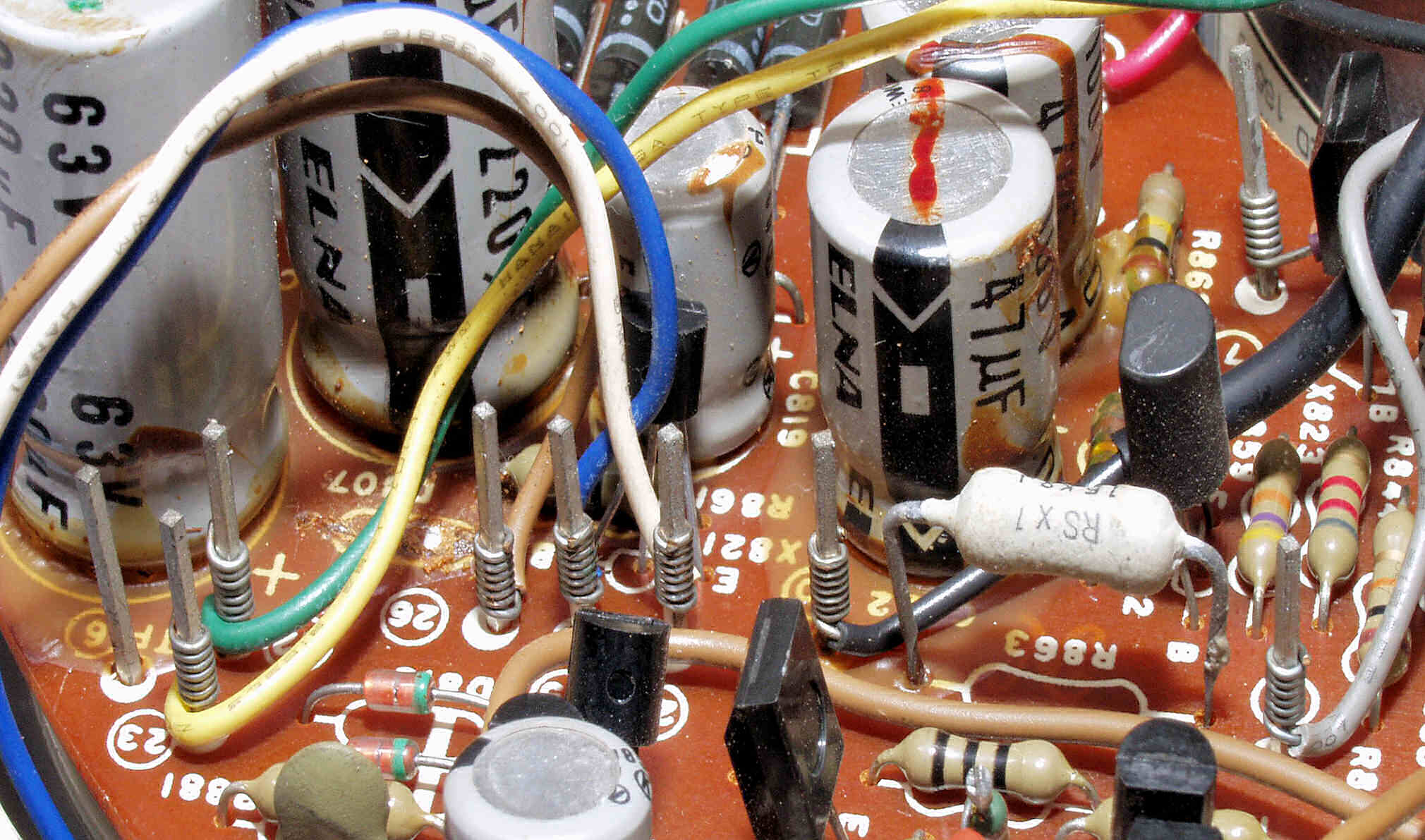 | C112. 修理前 基板電解コンデンサー固定接着材、トルエンが使用してあり、銅線を犯すので、取り去る。 | ||||||||||||||||||||||||||||