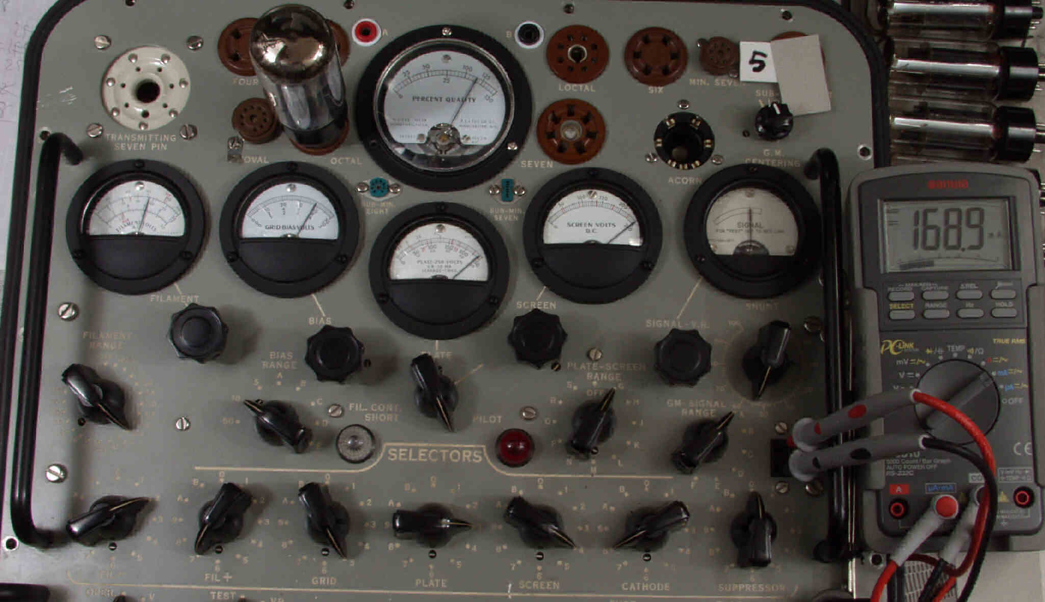 M5. 5本目 6G-B8 測定。 Gm=23000μmho、Ip=168.9mA。RangeSW=A、FullScale=30000μmho。