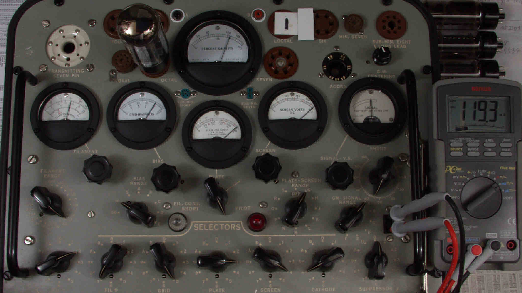 E1. 1本目 6G-B8 測定。 Gm=23000μmho、Ip=119.5mA。RangeSW=A、FullScale=30000μmho。