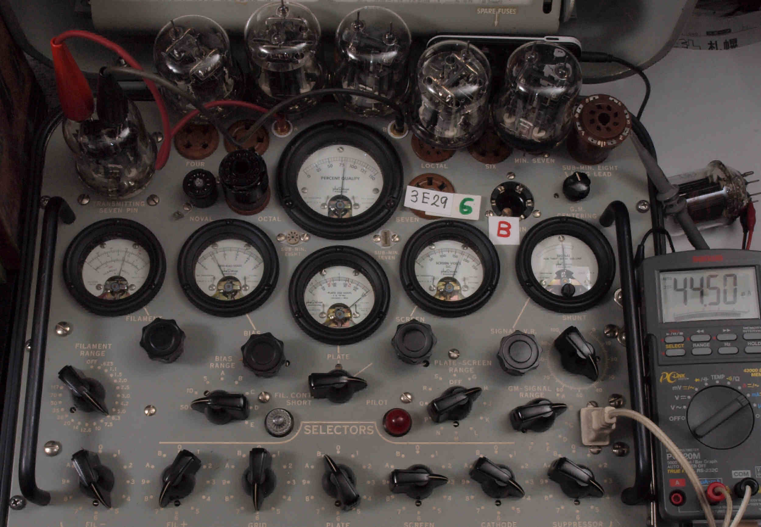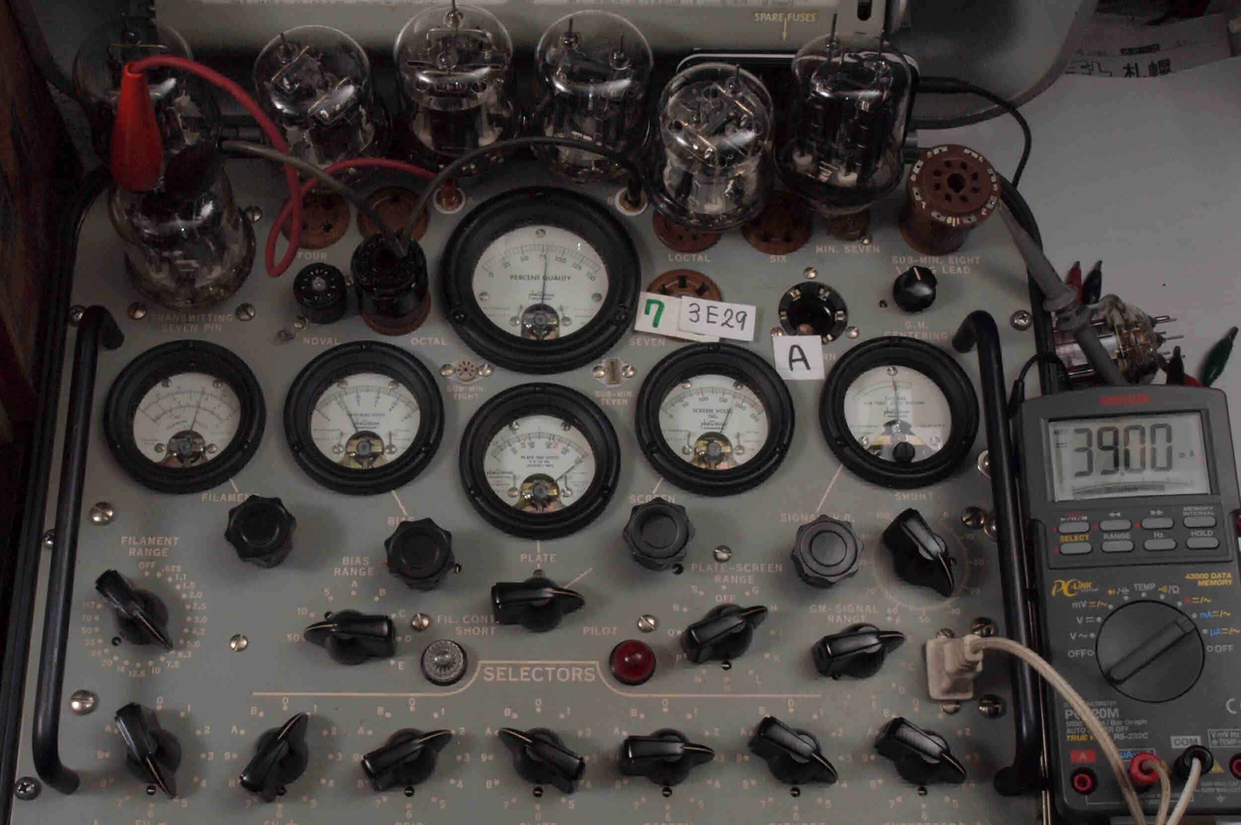 | A31. 3本目 3E29 ユニット1測定。 Gm=7700μmho、Ip=62.1mA。 測定条件、 「Ep=250V、Esg=175V、Eg1=−12V」RangeSW=C、FullScale=15000μmho。 |