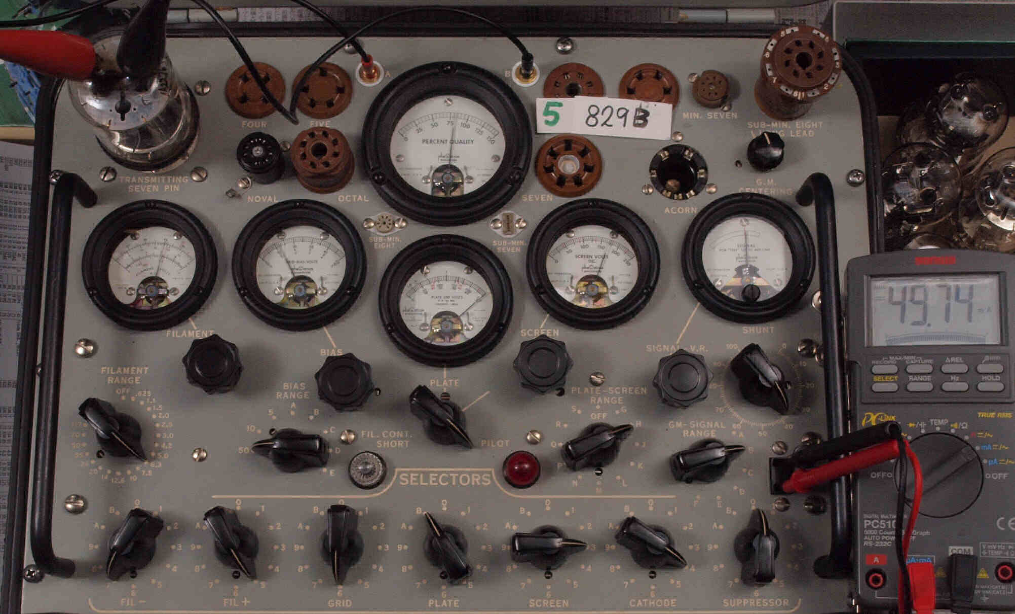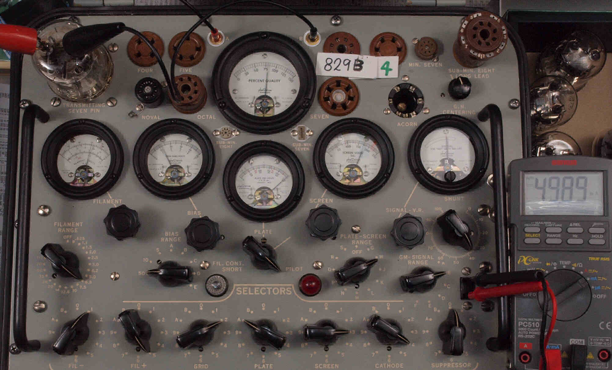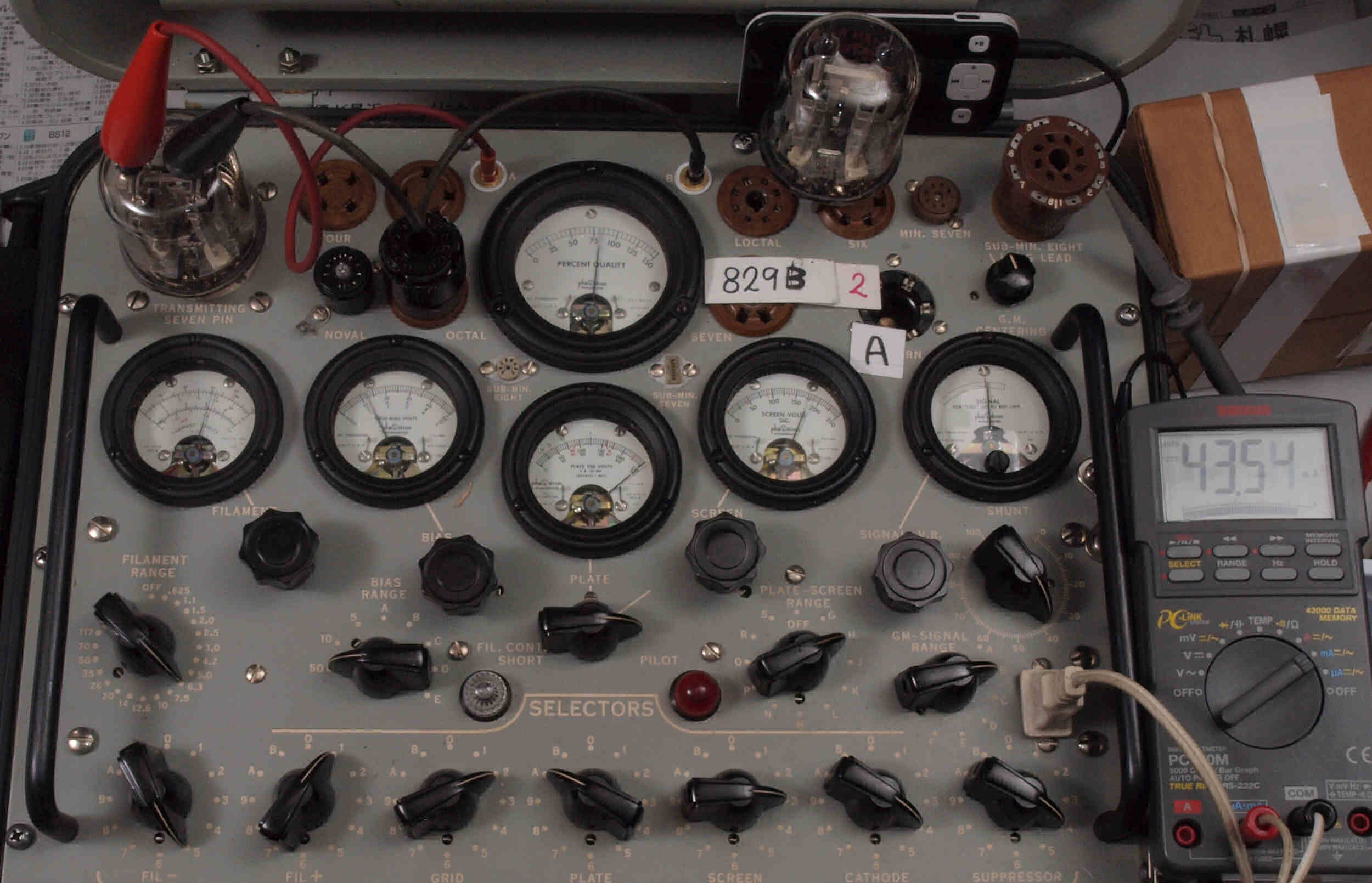 | B41. 4本目 829B ユニット1測定。 Gm=8000μmho、Ip=49.89mA。 測定条件、 「Ep=250V、Esg=175V、Eg1=−12V」RangeSW=C、FullScale=15000μmho。 |