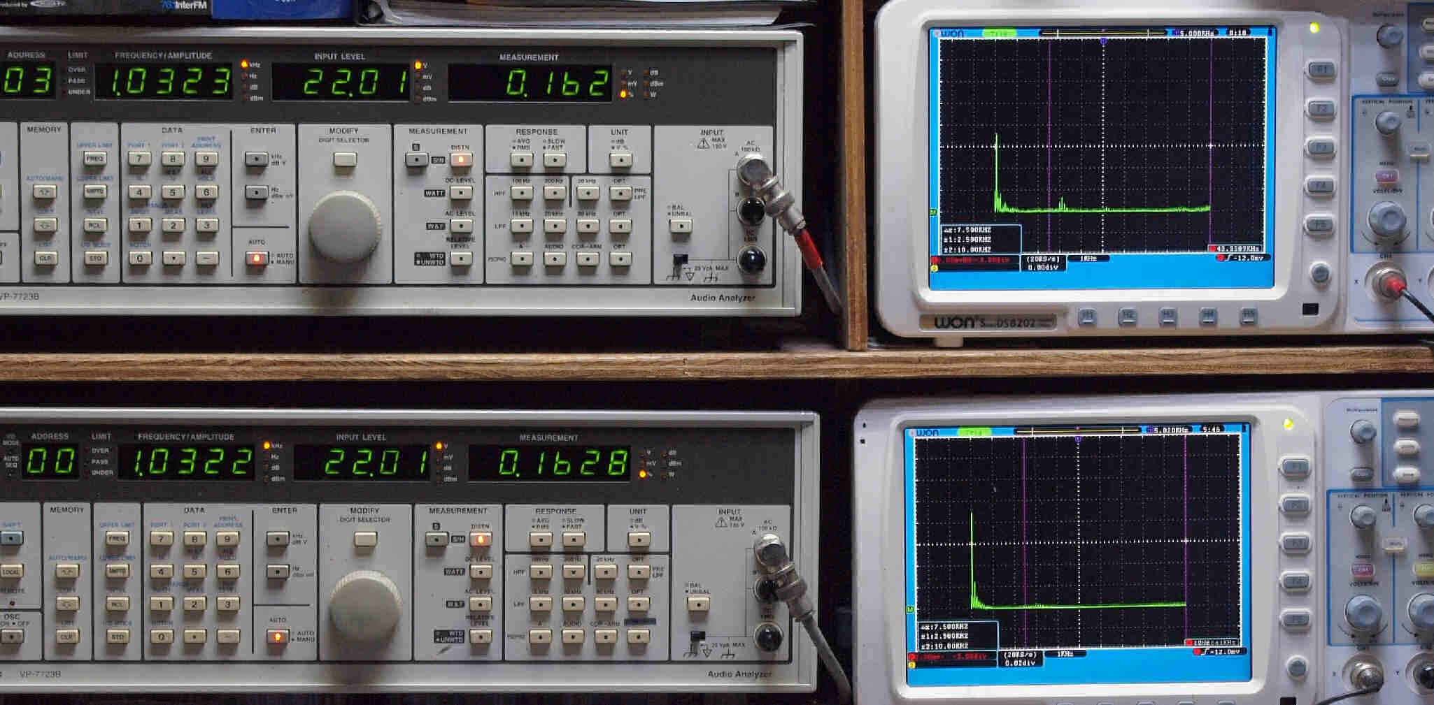 | E. 測定・調整 E1. 出力・歪み率測定・調整 「見方」。 上段中 右側SP出力を「Audio Analyzer Panasonic VP−7723B」により測定。 表示LED、 左端=メモリーNo、 中左=周波数測定、 中右=出力電圧測定、 右端=歪み率測定。 上段右端 VP−7723Bの基本波除去出力を「owon SDS8202(200MHZ)」で「FFT分析」表示。 下段中 左側SP出力を「Audio Analyzer Panasonic VP−7723B」により測定。 表示LED、 左端=メモリーNo、 中左=周波数測定、 中右=出力電圧測定、 右端=歪み率測定。 下段右端 VP−7723Bの基本波除去出力を「owon SDS6062(200MHZ)」で「FFT分析」表示。 下段左端 オーディオ発振器 VP−7201A より50Hz〜100kHzの信号を出し(歪み率=約0.003%)、ATT+分配器を通し、AMPに入力。 よって、ダイアル設定出力レベルより低くなります。測定機器の仕様や整備の様子はこちら、「VP−7723B」「VP−7201A」。 FFT画面の見方はこちら。 |