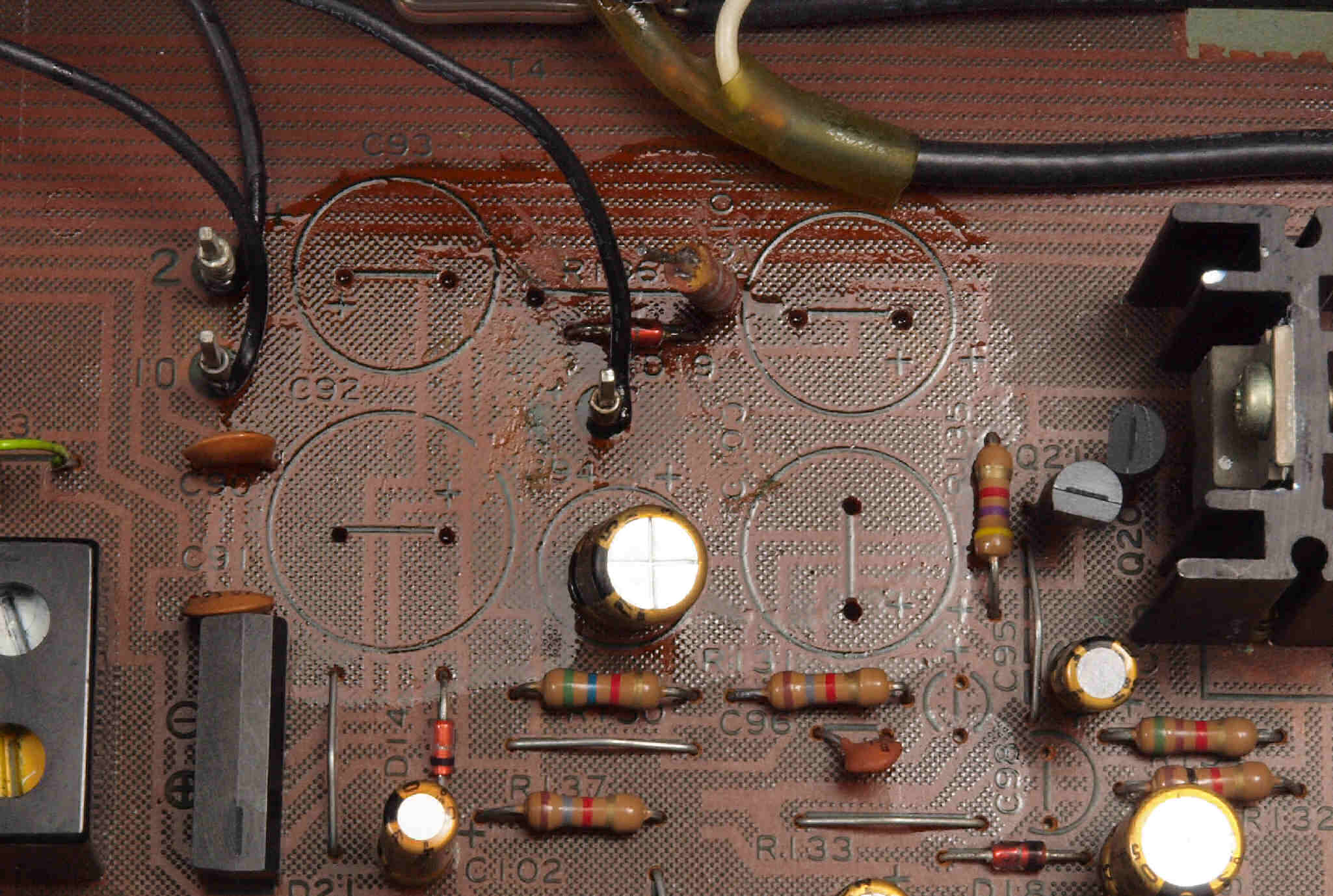 | C112. 修理中 メイン基板。電解コンデンサー固定するトルエン溶媒の接着剤。 | ||||||||||||||||||||||||||||||||||||||||||||