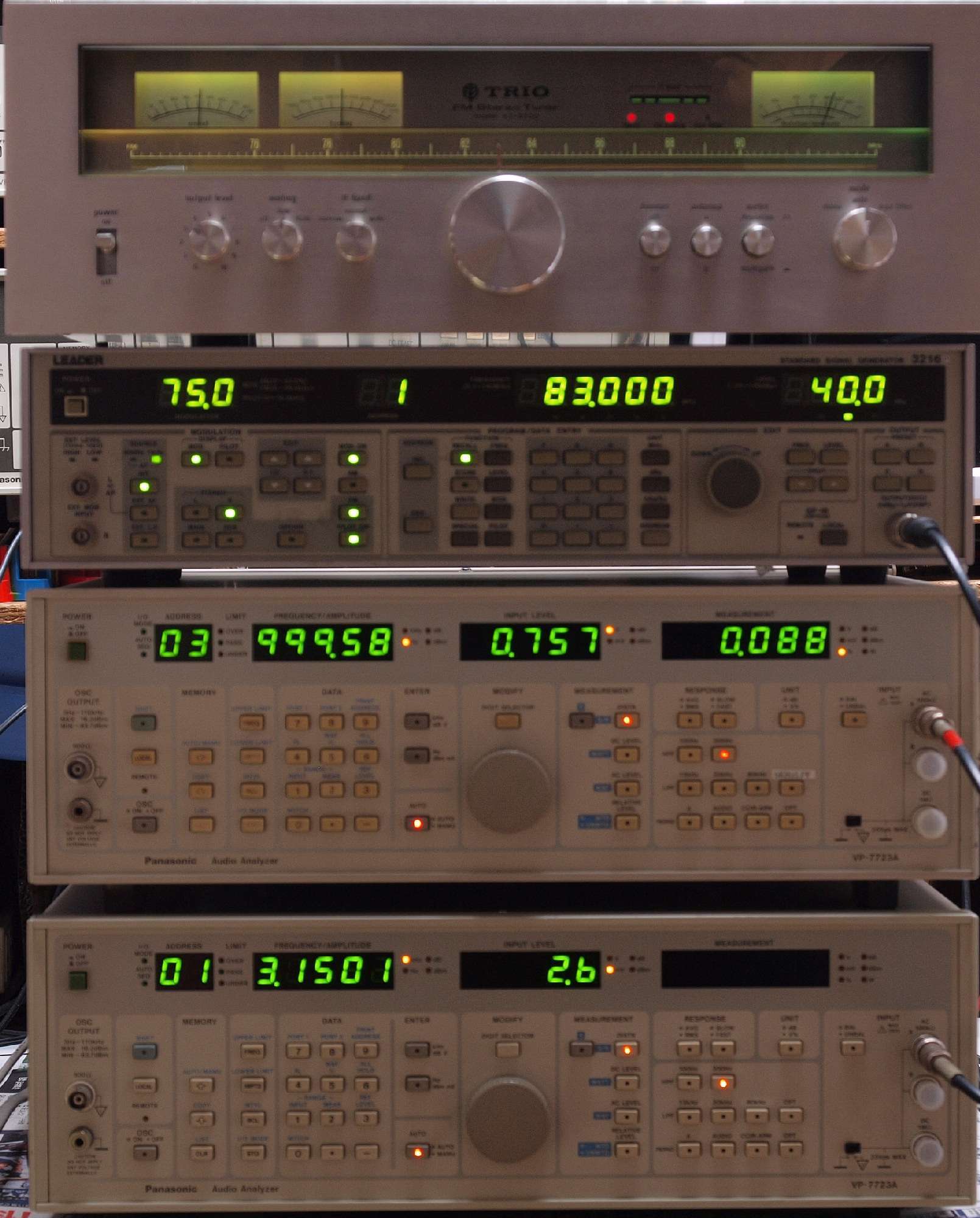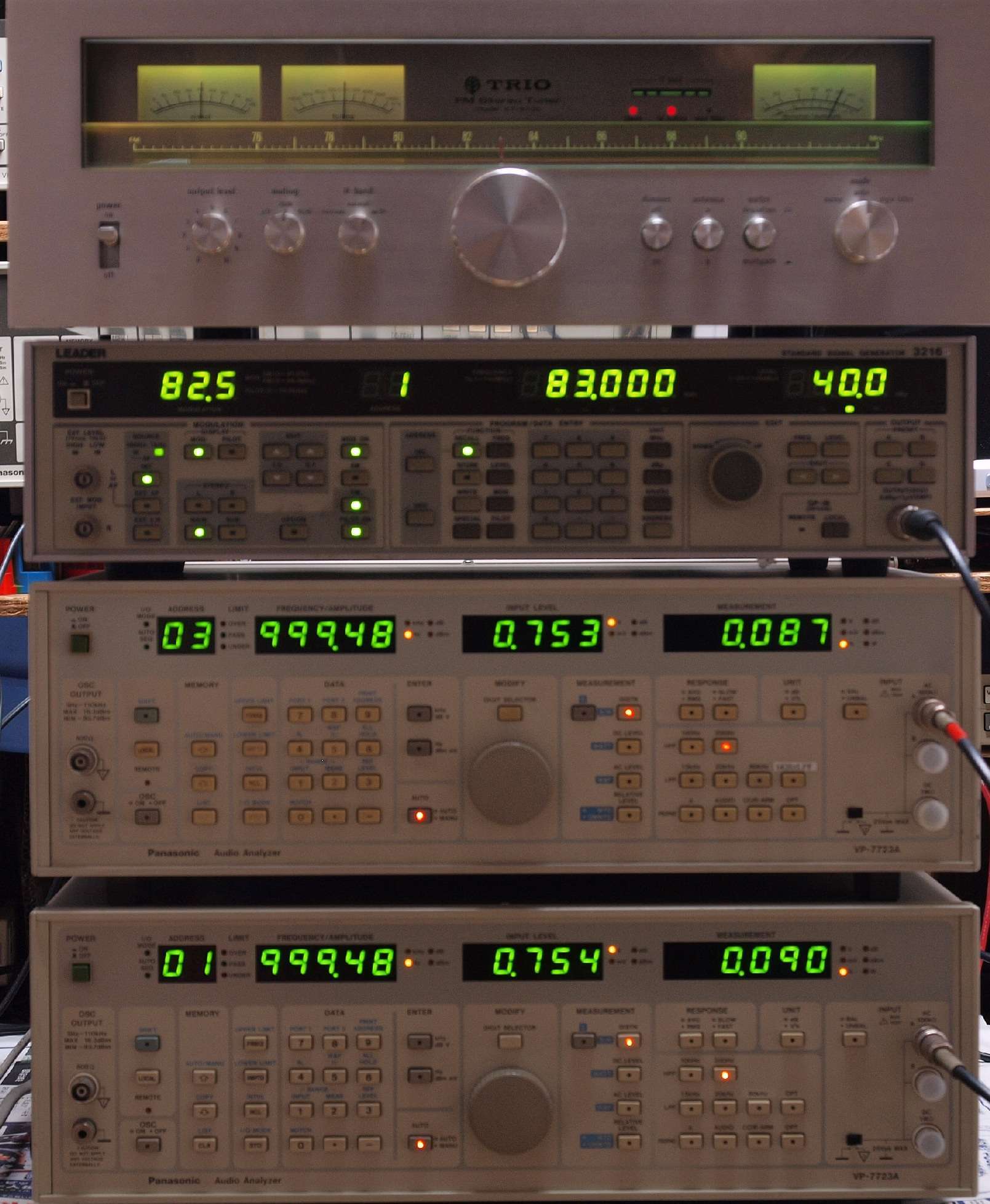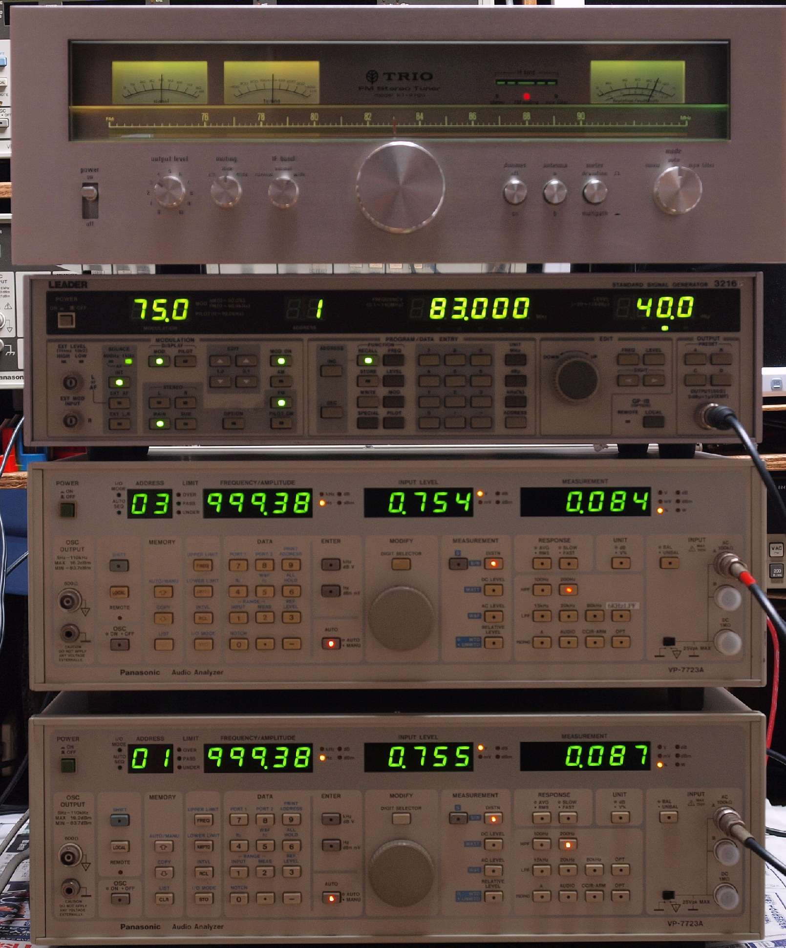| E. 調整・測定、 「FM受信感度、RL分離測定、周波数調整」. <見方> 中上の「LEADER 3216P FM ステレオ信号発信器」より信号を出す。 これを受信し出力を測定する。 表示LED、 左端=変調度、 中左=メモリNo、 中右=出力周波数、 右端=出力レベル。 中下=R出力測定。 「Audio Analyzer Panasonic VP−7723B」より測定。 表示LED、 左端=メモリーNo、 中左=周波数測定、 中右=出力電圧測定、 右端=歪み率測定。 下=L出力測定。 「Audio Analyzer Panasonic VP−7723B」より測定。 表示LED、 左端=メモリーNo、 中左=周波数測定、 中右=出力電圧測定、 右端=歪み率測定。 |