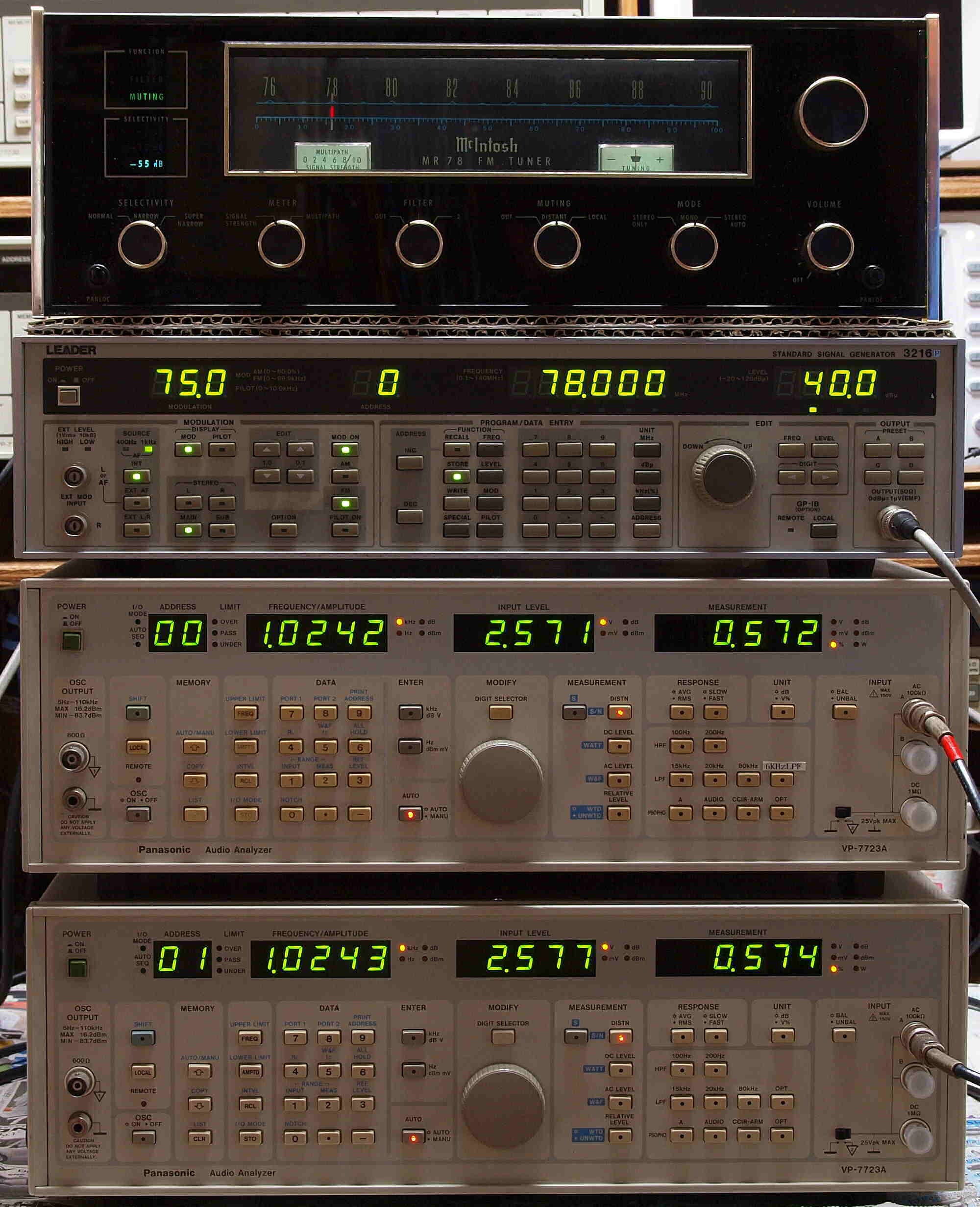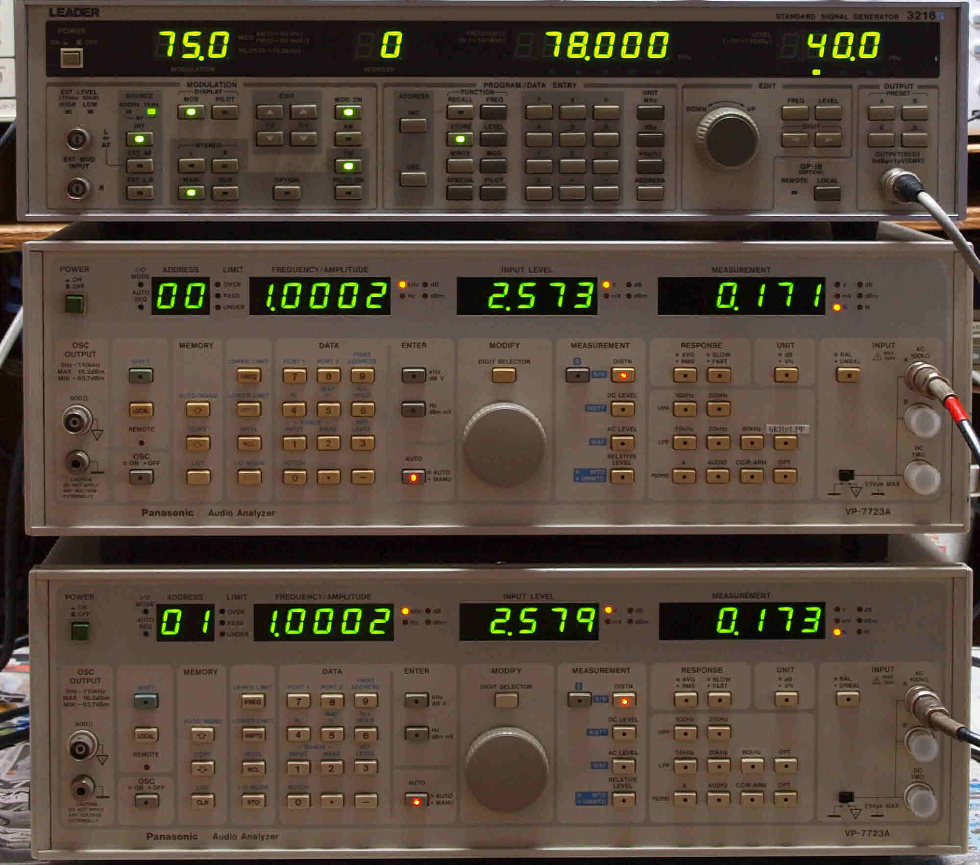 上の「LEADER 3216P FM ステレオ信号発信器」より信号を出す。 これを受信し出力を測定する。