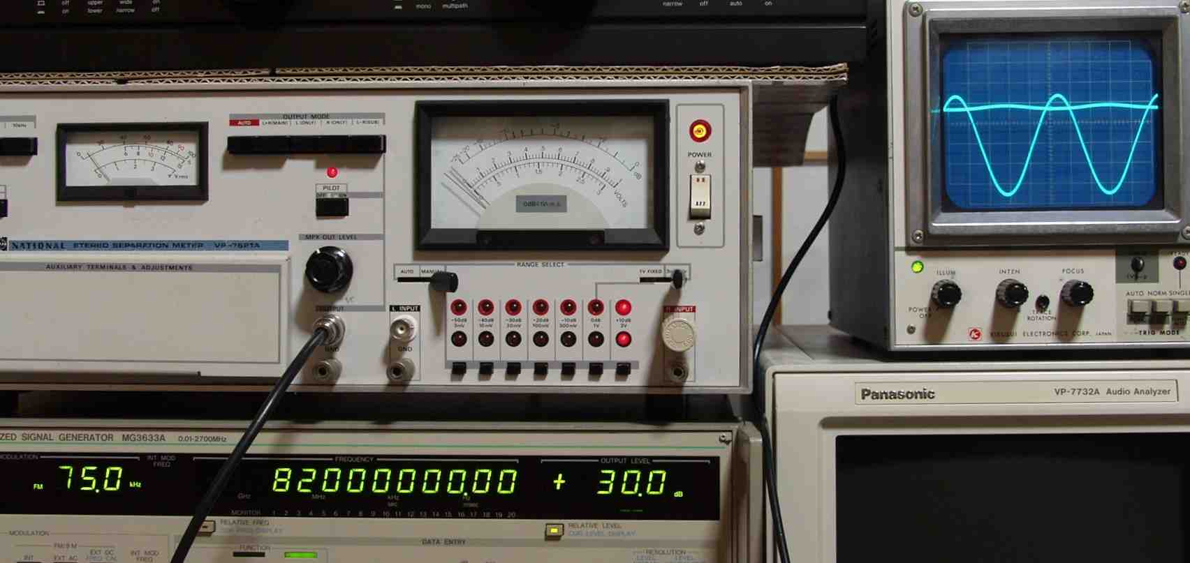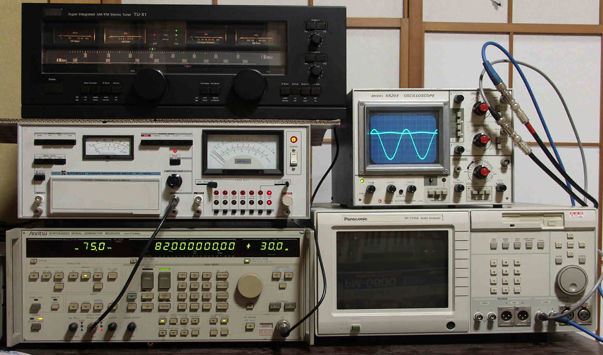| E. 調整・測定 E1. 感度測定調整 機器の機能 左中=FMステレオ信号発信器 左=高周波信号発信器 右上=オシロ(上=R出力、下=L出力) 下左側=歪み率計(上=R出力、下=L出力) |