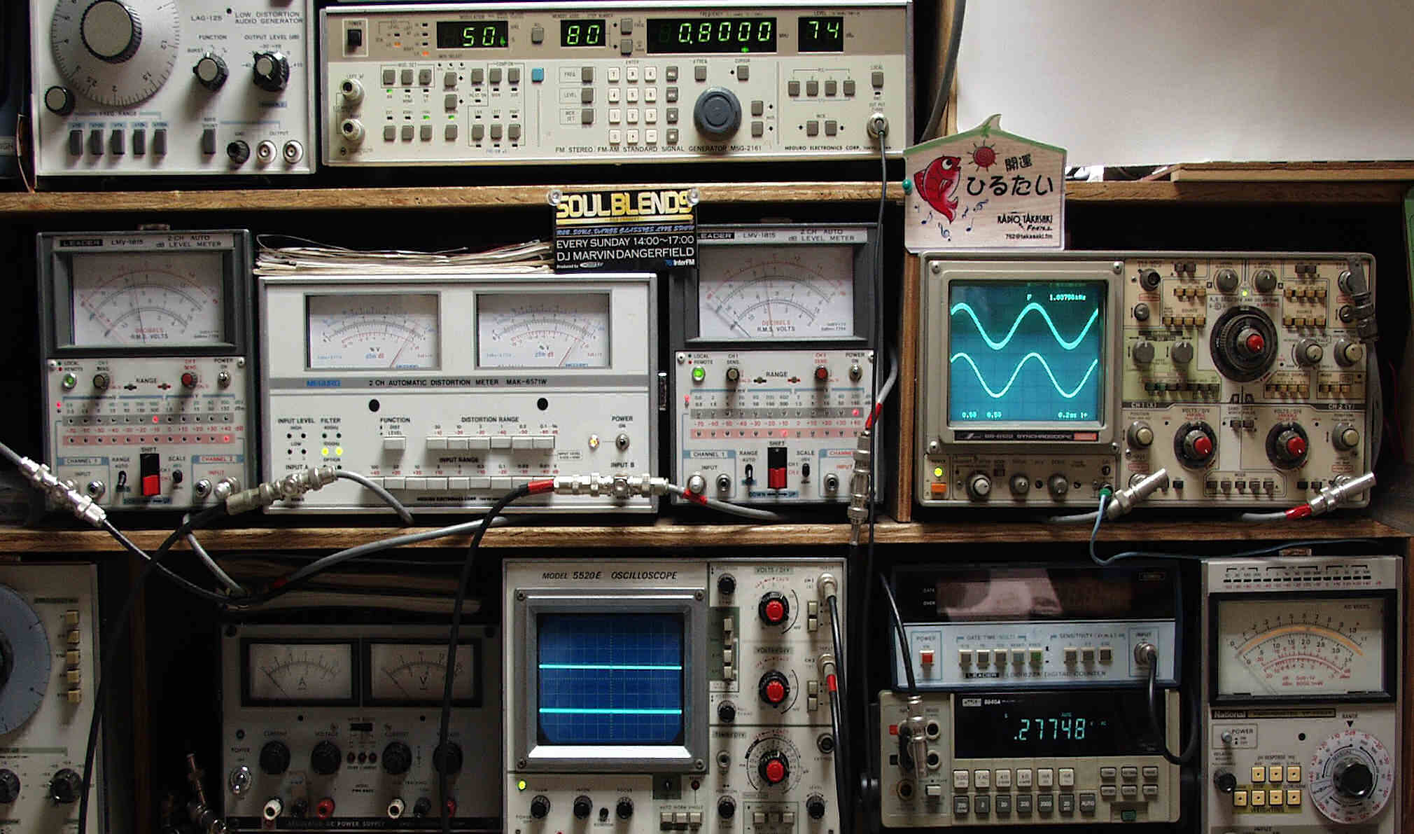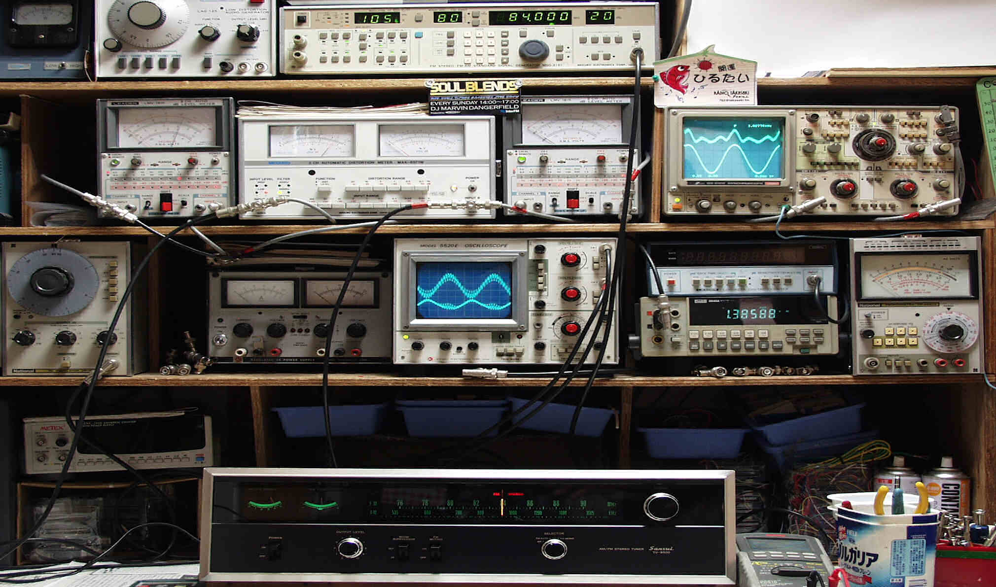 | E. 調整・測定 E0. 感度測定調整 <見方> 上右=AM・FMステレオ信号発信器 中左端電圧計=L側出力電圧測定、黒針のみ使用 中中左歪み率計=出力の歪み率測定 左メータ=L出力、右メータ=R出力 中中右=R側出力電圧測定、赤針のみ使用 中右端オシロ=出力波形 上=R出力、下=L出力 下中右上デジタル電圧計=出力電圧測定RLは切り替えて測定 |