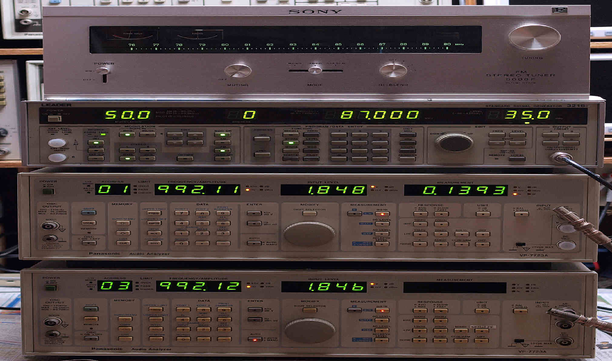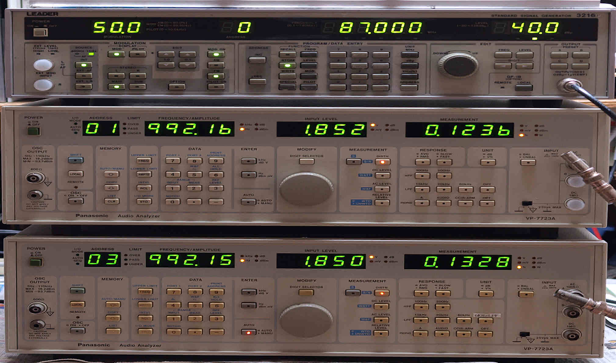| E. 調整・測定、 FM受信感度、RL分離測定調整。画像をクリックすると、大きく(横幅2050ドット)表示されます。 <見方> 中上の「LEADER 3216P FM ステレオ信号発信器」より信号を出す。 これを受信し出力を測定する。 表示LED、 左端=変調度、 中左=メモリNo、 中右=出力周波数、 右端=出力レベル。 中下=R出力測定。 「Audio Analyzer Panasonic VP−7723B」より測定。 表示LED、 左端=メモリーNo、 中左=周波数測定、 中右=出力電圧測定、 右端=歪み率測定。 下=L出力測定。 「Audio Analyzer Panasonic VP−7723B」より測定。 表示LED、 左端=メモリーNo、 中左=周波数測定、 中右=出力電圧測定、 右端=歪み率測定。 |