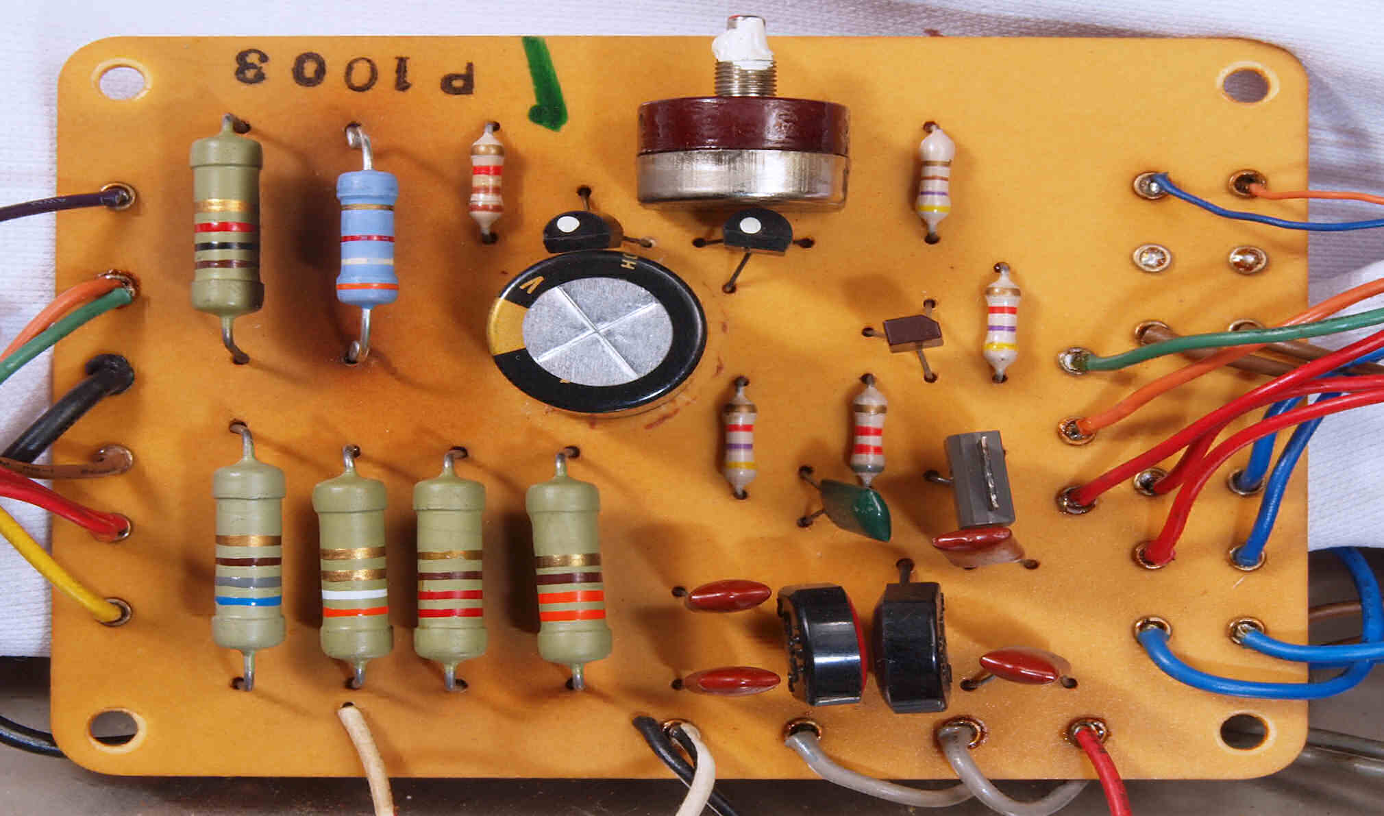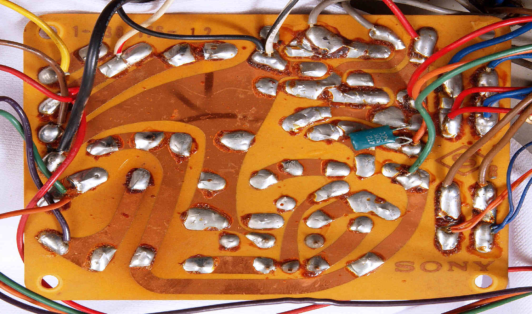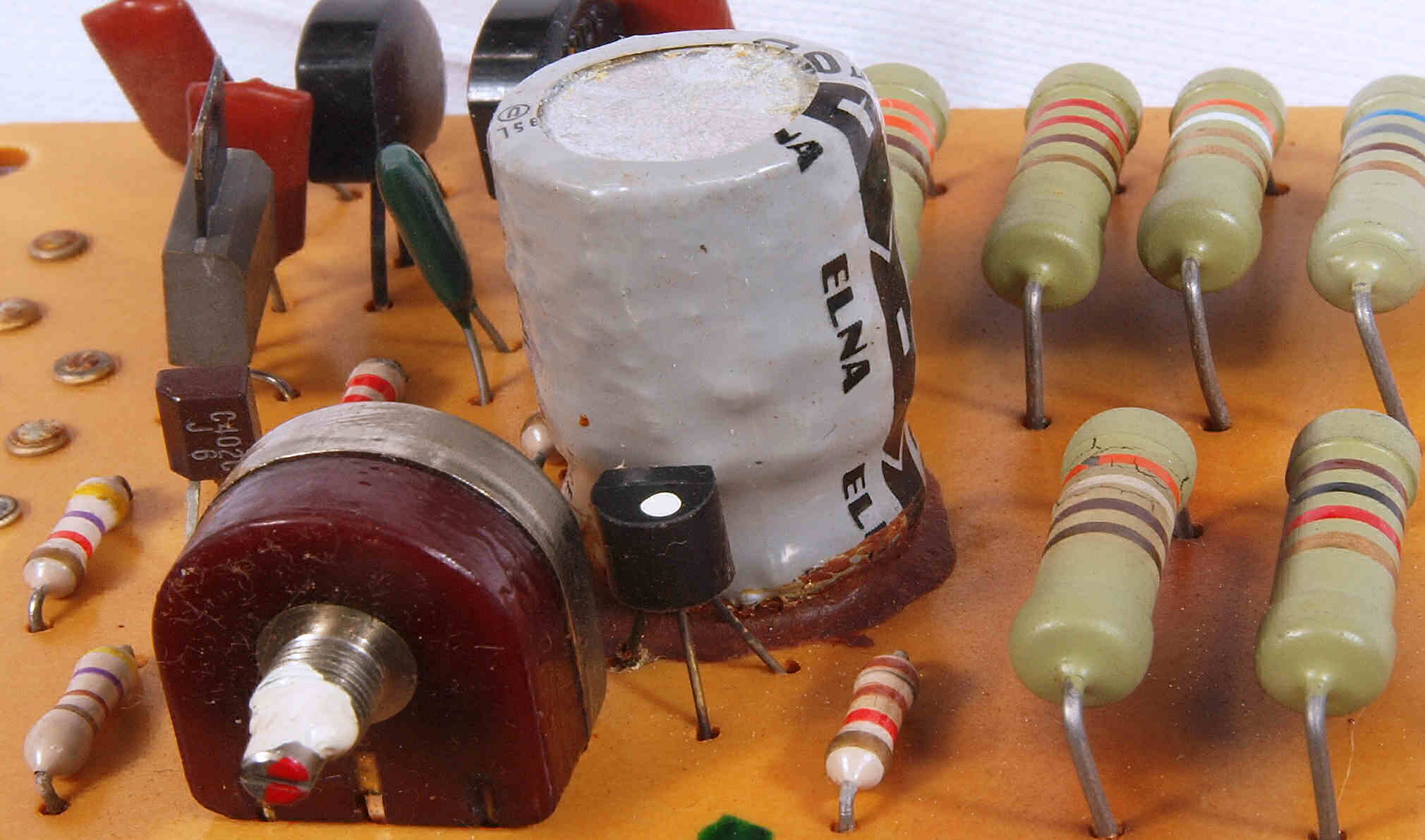 | A43. 点検中 この時代の基板の部品は、人間が挿入して半田付けをしたので、リード線が確実に曲げてあり、取るのも大変。 | ||||||||||||||||||||||||||||||||||||||||||||||||||||||||||||||||||