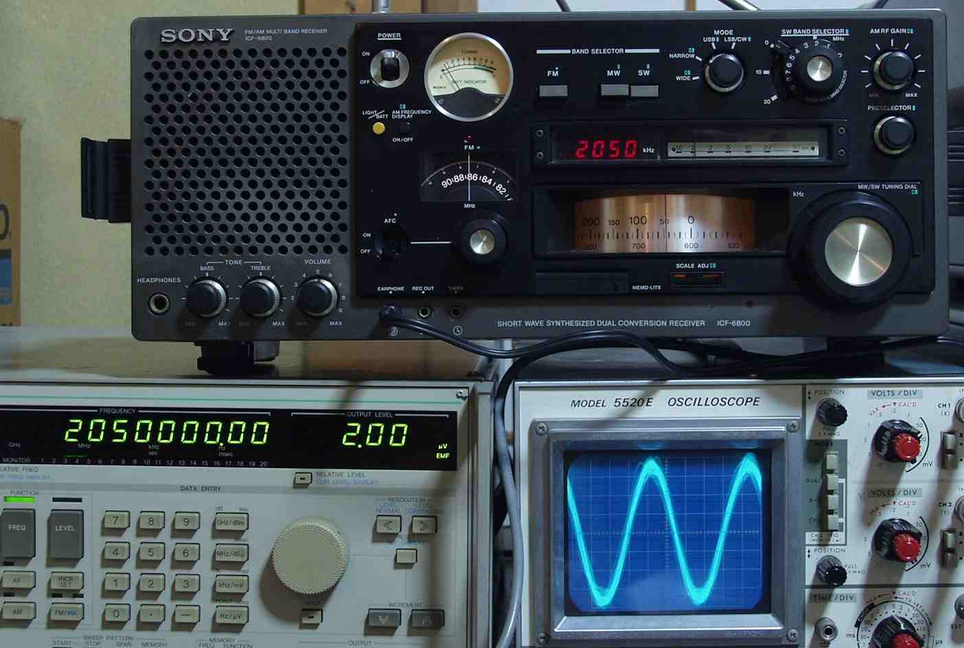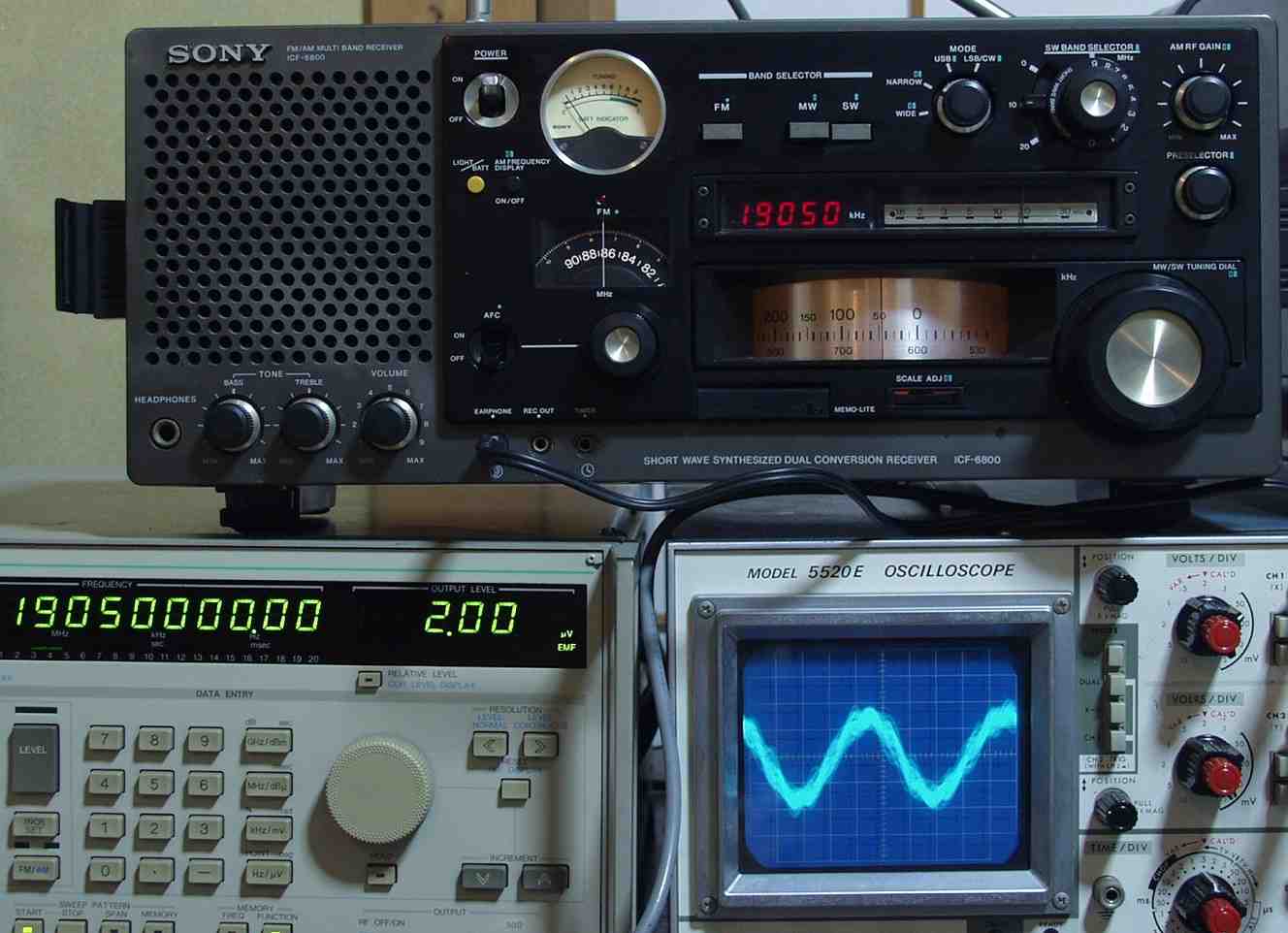 | E.調整・測定 下のSSGより2.05MHZのキャリヤに400HZを50%変調かけて2μVを受信 SP出力を左のオシロで見る 以下、SW測定は周波数の変更のみで測定 プロの受信機測定は此方 アマチュア機器の測定は此方 |