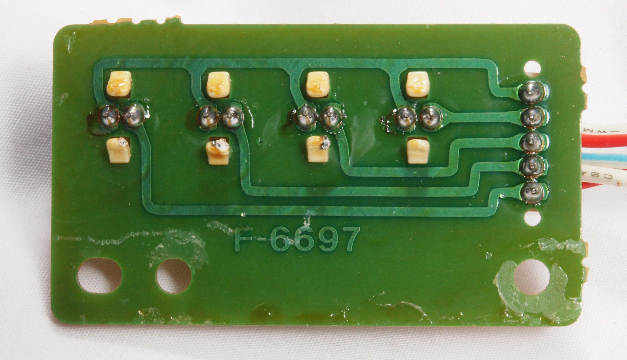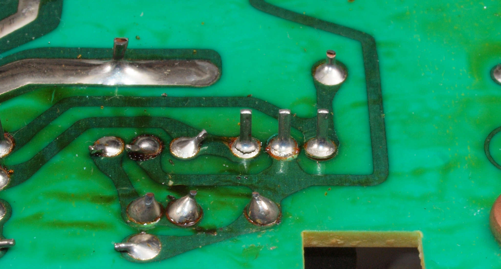 | C634. 修理後 L側ドライブ基板裏。 ドライブTR(トランジスター)の足の銅箔を広げる。 | ||||||||||||||||||||||||||||||||||||||||||||||||||||