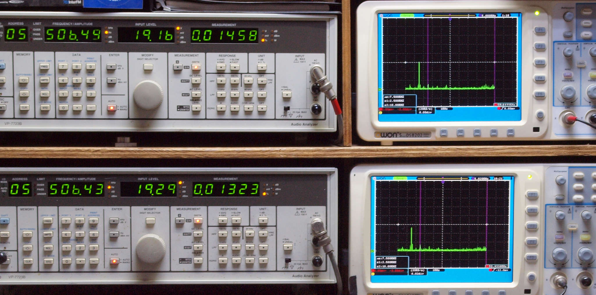 | E. 測定・調整。 画像をクリックすると、大きく(横幅2050ドット)表示されます。 E0. 出力・歪み率測定・調整 「見方」。 上段中 右側SP出力を「Audio Analyzer Panasonic VP−7723B」により測定。 表示LED、 左端=メモリーNo、 中左=周波数測定、 中右=出力電圧測定、 右端=歪み率測定。 上段右端 VP−7723Bの基本波除去出力を「owon SDS8202(200MHZ)」で「FFT分析」表示。 下段中 左側SP出力を「Audio Analyzer Panasonic VP−7723B」により測定。 表示LED、 左端=メモリーNo、 中左=周波数測定、 中右=出力電圧測定、 右端=歪み率測定。 下段右端 VP−7723Bの基本波除去出力を「owon SDS6062(200MHZ)」で「FFT分析」表示。 下段左端 オーディオ発振器 VP−7201A より50Hz〜100kHzの信号を出し(歪み率=約0.003%)、ATT+分配器を通し、AMPに入力。 よって、ダイアル設定出力レベルより低くなります。測定機器の仕様や整備の様子はこちら、「VP−7723B」「VP−7201A」。 FFT画面の見方はこちら。 |