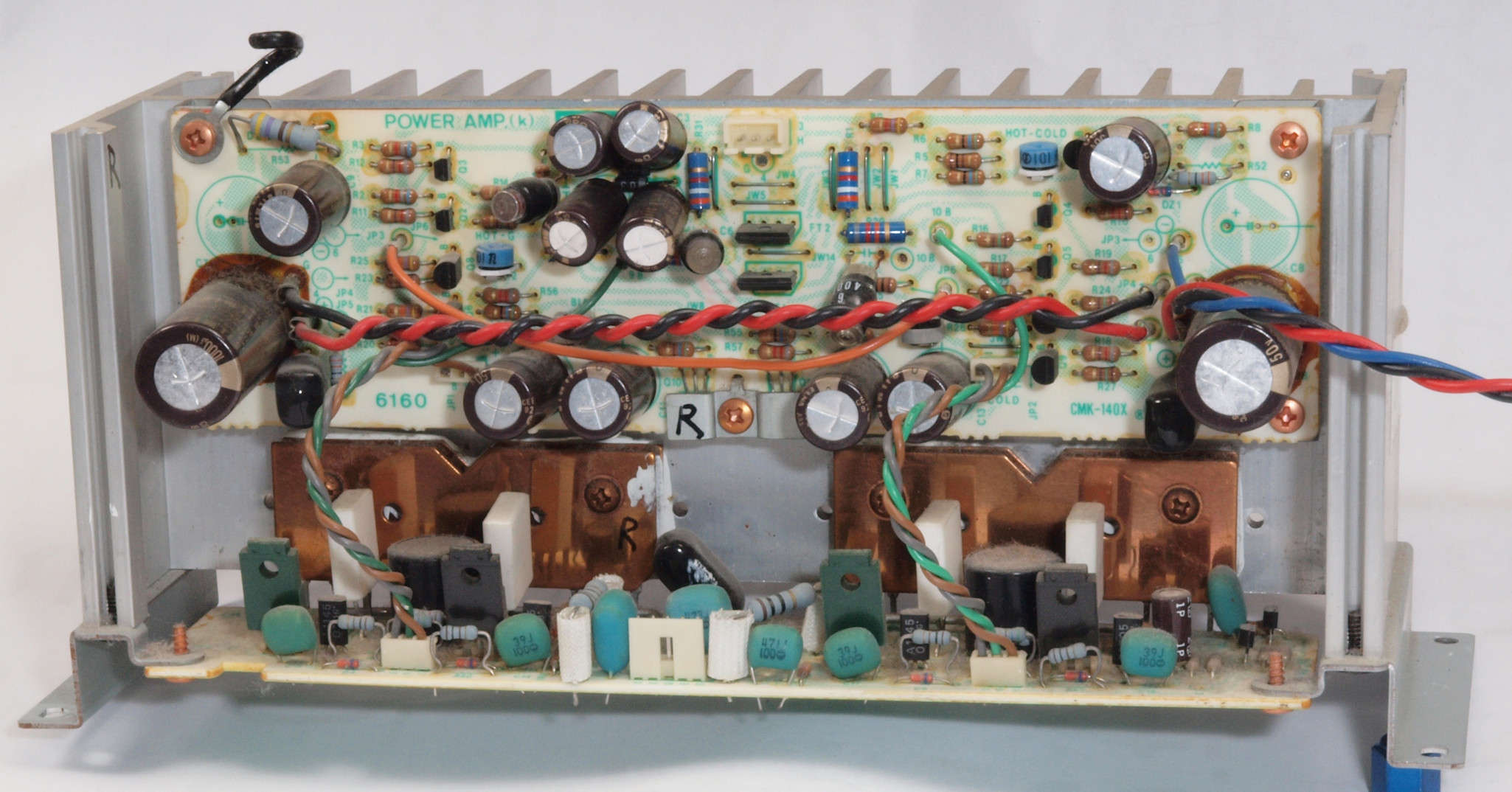 | C712. 修理前 L側AMP基板。電解コンデンサー固定用の接着材、当時は溶媒にトルエンが使用されており、銅を腐食する。 | ||||||||||||||||||||||||||||||||||||||||||||||||||||