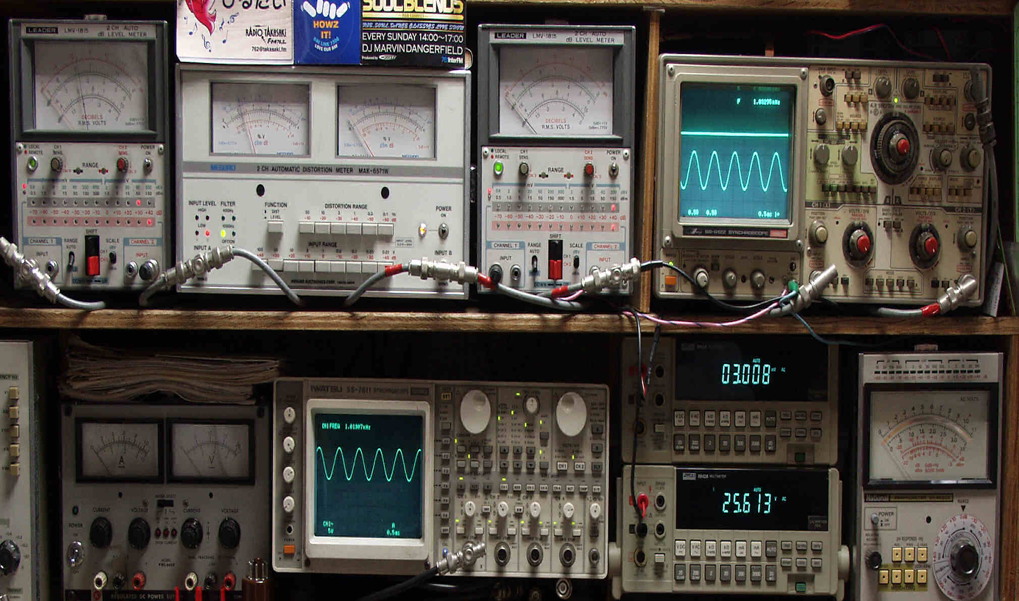 | T. 修理前の測定 T0. 出力・歪み率測定 <見方> 下段左端 オーディオ発振器より400HZ・1KHZの信号を出し(歪み率=約0.003%)これをAMPに入力し、出力を測定 下段中左 オシロ=入力波形(オーディオ発振器のTTLレベル) 下段中右上=周波数計 上段左端 電圧計=L側出力電圧測定、黒針のみ使用 上段中左 歪み率計=出力の歪み率測定 左メータ=L出力、右メータ=R出力 上段中右 電圧計=R側出力電圧測定、赤針のみ使用 上段右端 オシロ=出力波形 上=R出力、下=L出力(実際にはRL電圧計の出力「Max1V」を観測) 下段中右上 デジタル電圧計=R出力電圧測定 下段中右下 デジタル電圧計=L出力電圧測定 |