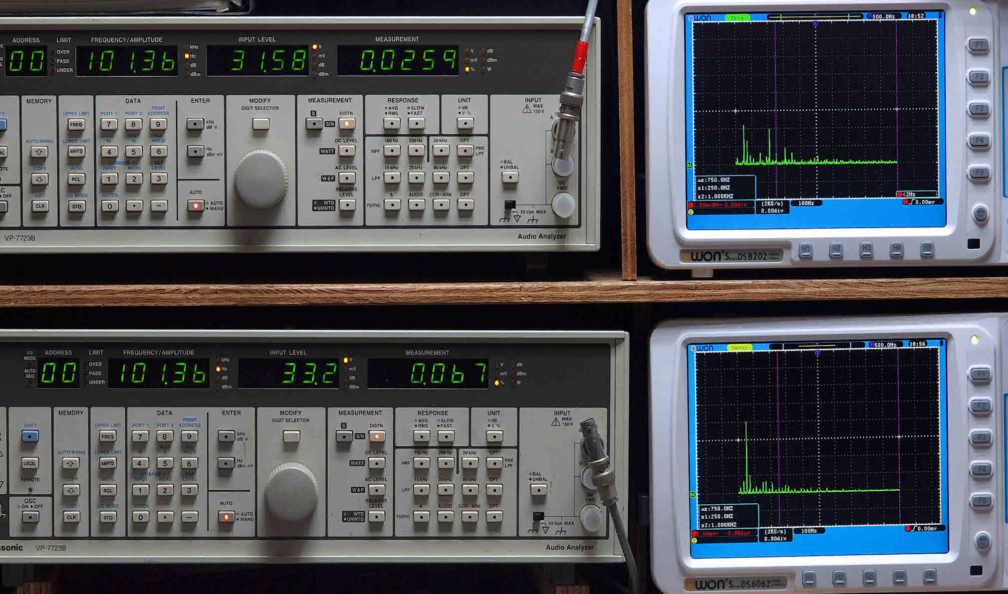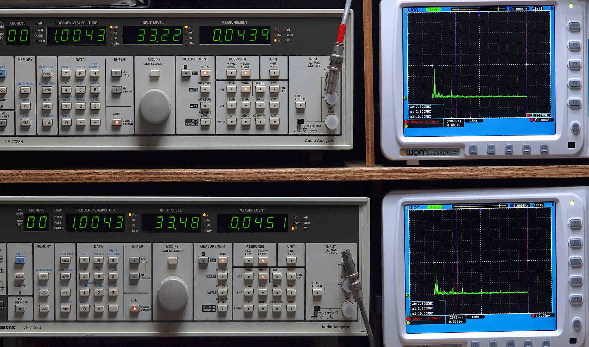 | E. 測定・調整。 画像をクリックすると、大きく(横幅2050ドット)表示されます。 E1. 出力・歪み率測定・調整 「見方」。 上段中 右側SP出力を「Audio Analyzer Panasonic VP−7723B」により測定。 表示LED、 左端=メモリーNo、 中左=周波数測定、 中右=出力電圧測定、 右端=歪み率測定。 上段右端 VP−7723Bの基本波除去出力を「owon SDS8202(200MHZ)」で「FFT分析」表示。 下段中 左側SP出力を「Audio Analyzer Panasonic VP−7723B」により測定。 表示LED、 左端=メモリーNo、 中左=周波数測定、 中右=出力電圧測定、 右端=歪み率測定。 下段右端 VP−7723Bの基本波除去出力を「owon SDS6062(200MHZ)」で「FFT分析」表示。 下段左端 オーディオ発振器 VP−7201A より50Hz〜100kHzの信号を出し(歪み率=約0.003%)、ATT+分配器を通し、AMPに入力。 よって、ダイアル設定出力レベルより低くなります。測定機器の仕様や整備の様子はこちら、「VP−7723B」「VP−7201A」。 FFT画面の見方はこちら。 |