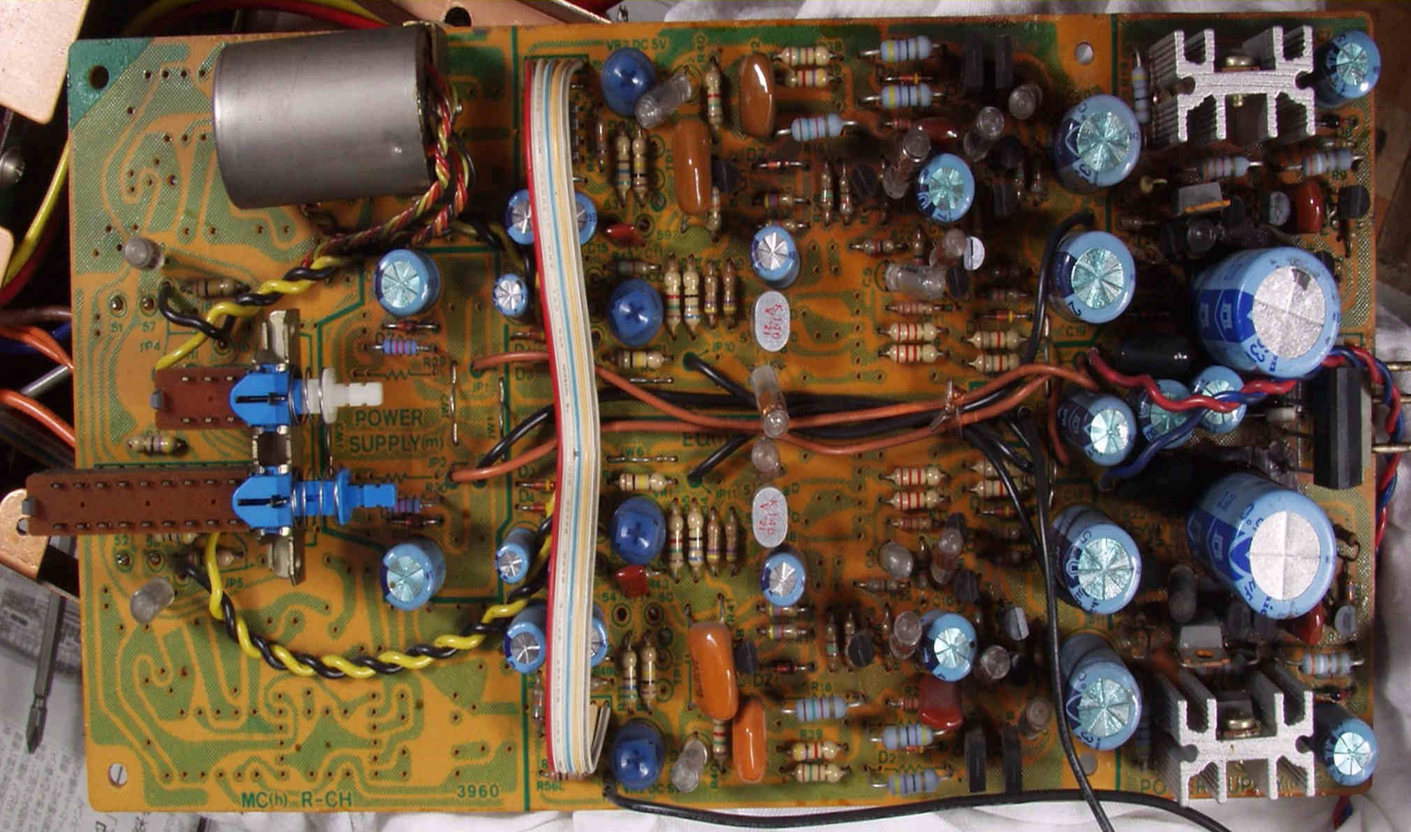 C1B. 修理後 メインAMP基板 初段FET(電界効果トランジスター)2個、バランス/バイアス調整用半固定VR4個、電解コンデンサー14個交換