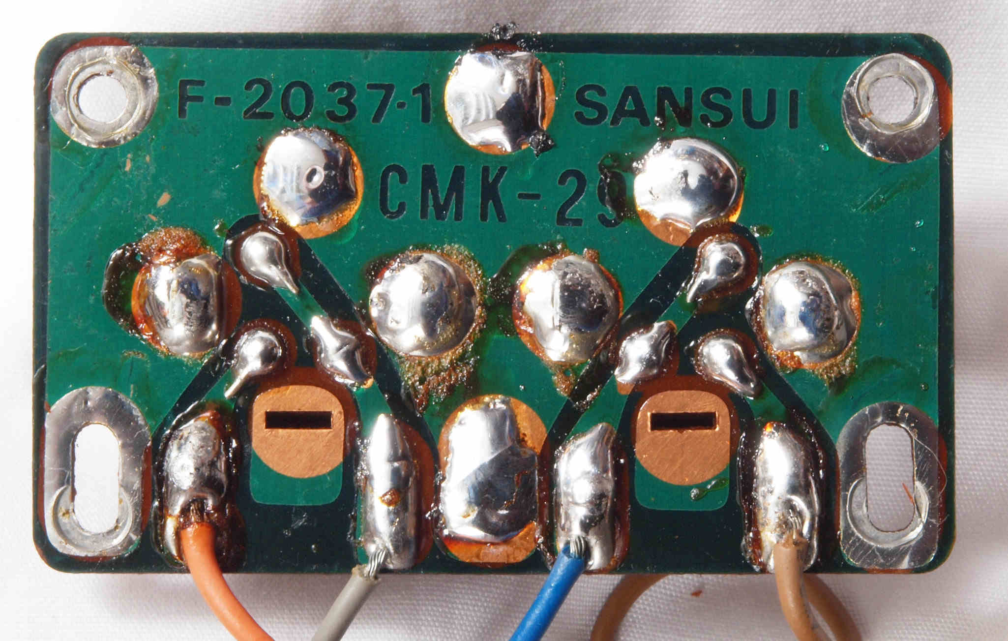 | CJ2. 修理前 TAPE1入力VR、TEAP2入力VR,AUX入力VR基板裏。 | ||||||||||||||||||||||||||||||||||||||||||