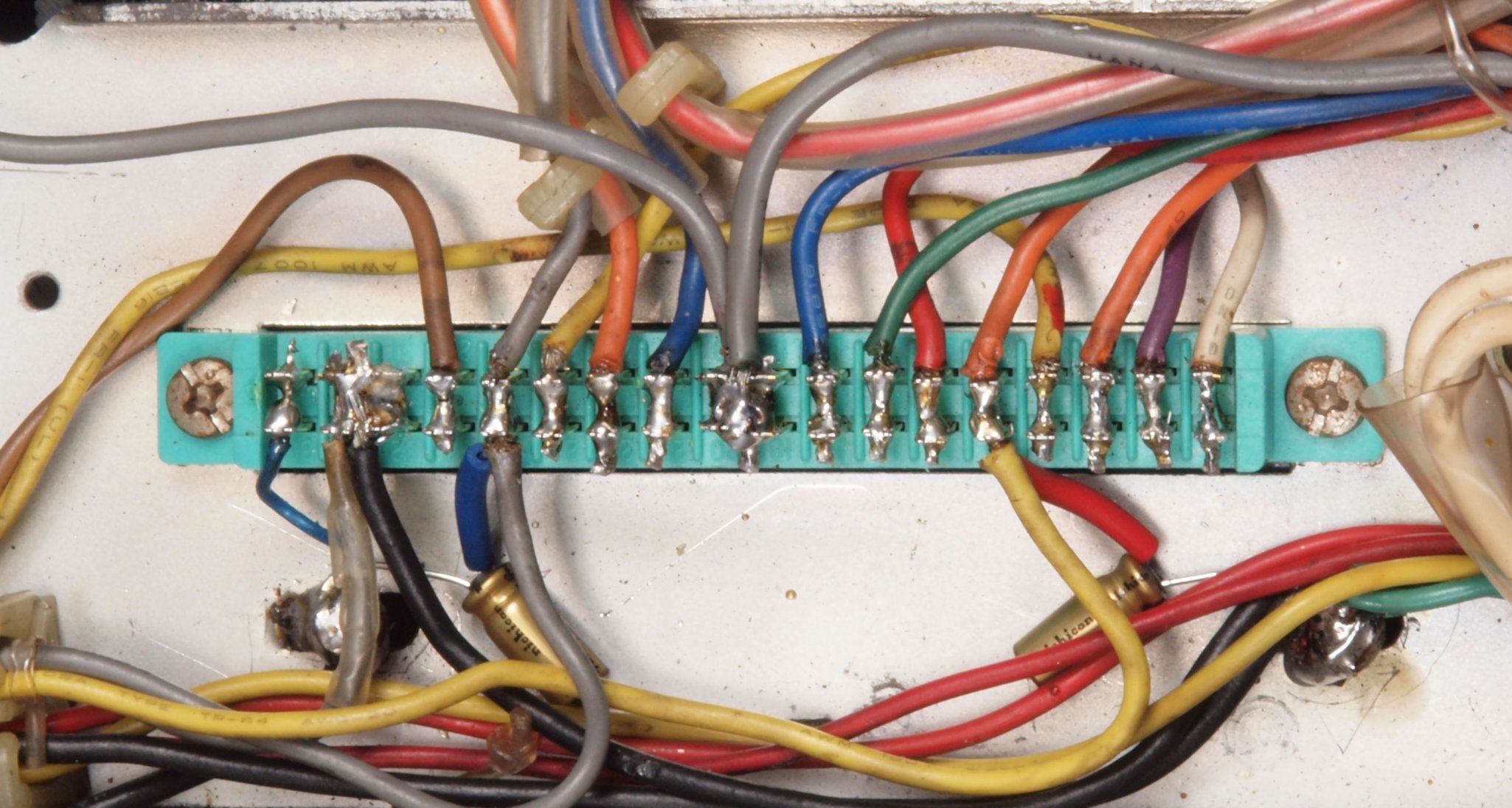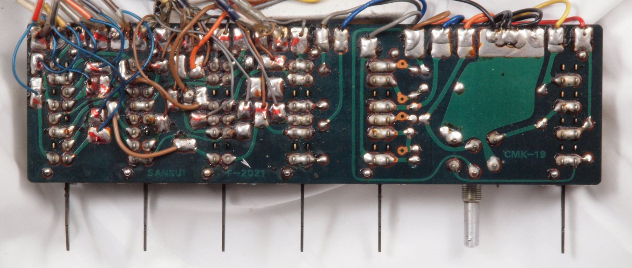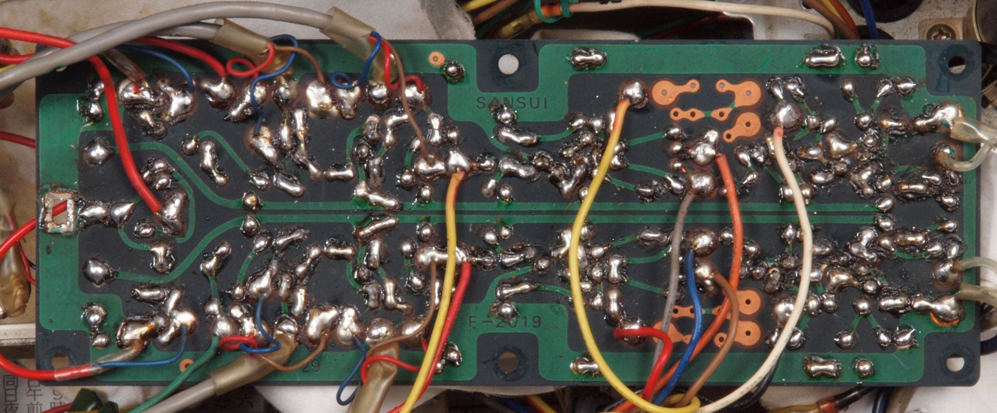 C232. 修理中 R側終段基板裏 コネクターへのバイパス配線半田付け。銅箔が浮いている。当時は定温半田コテは無、腕が悪いと銅箔はく離が生じる。