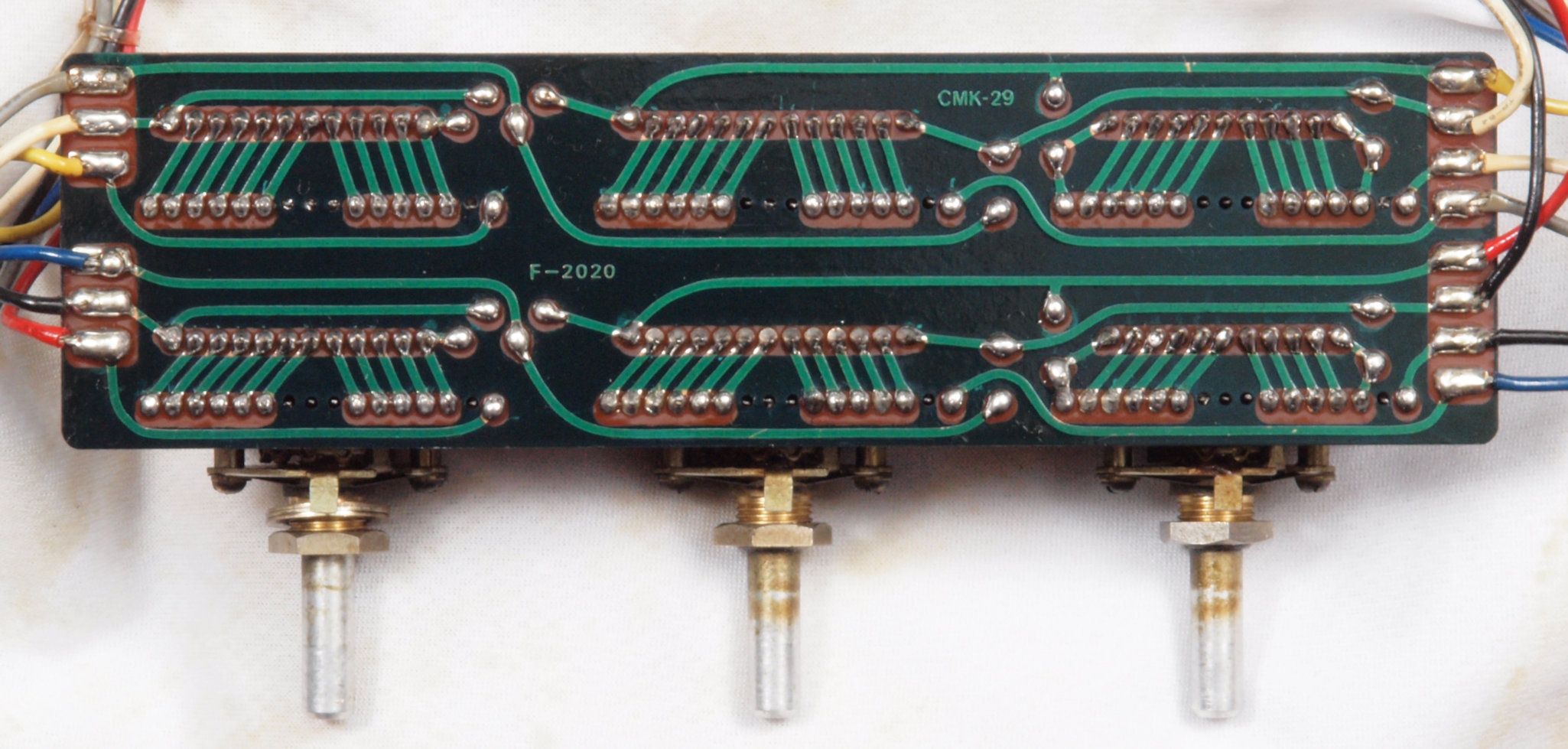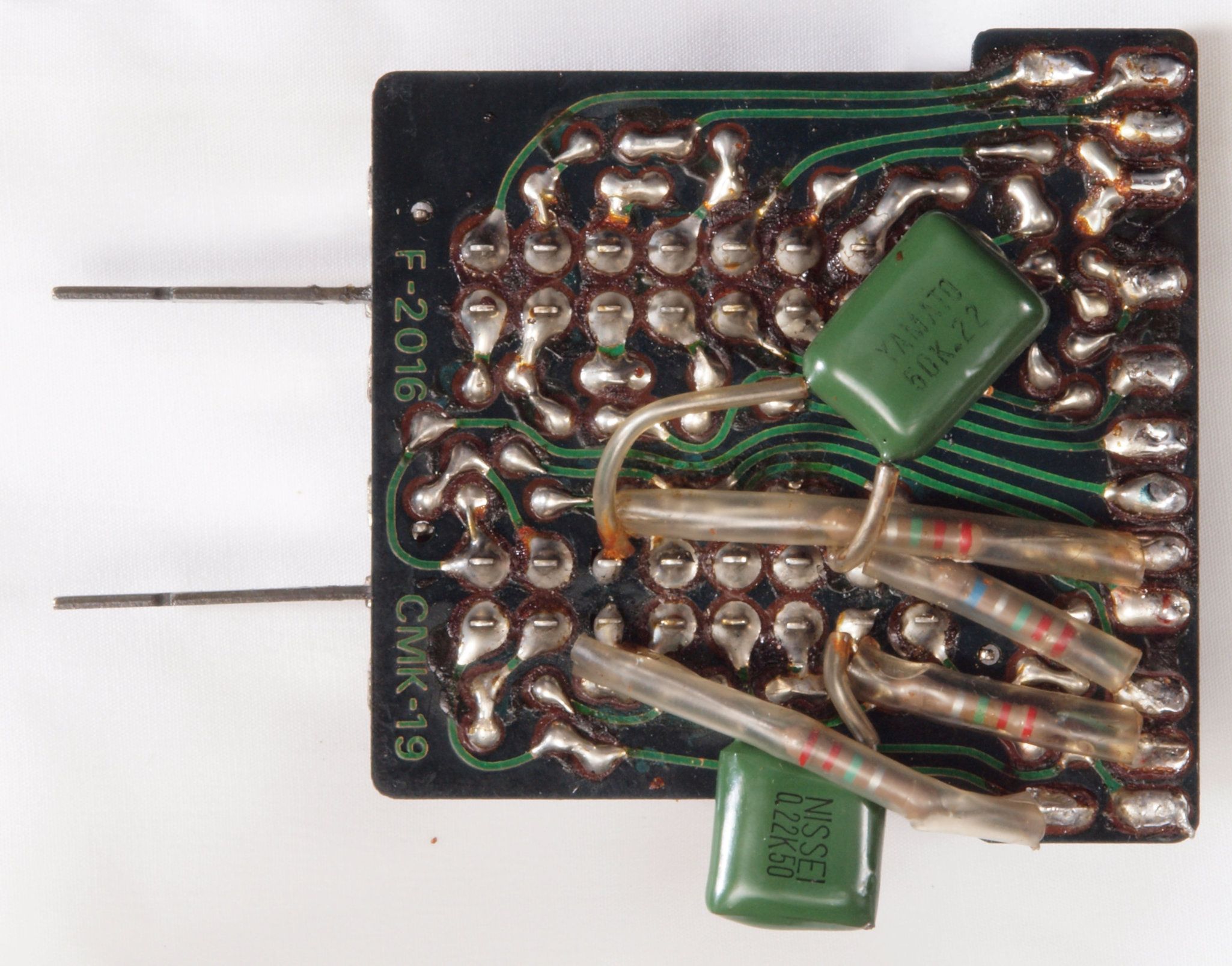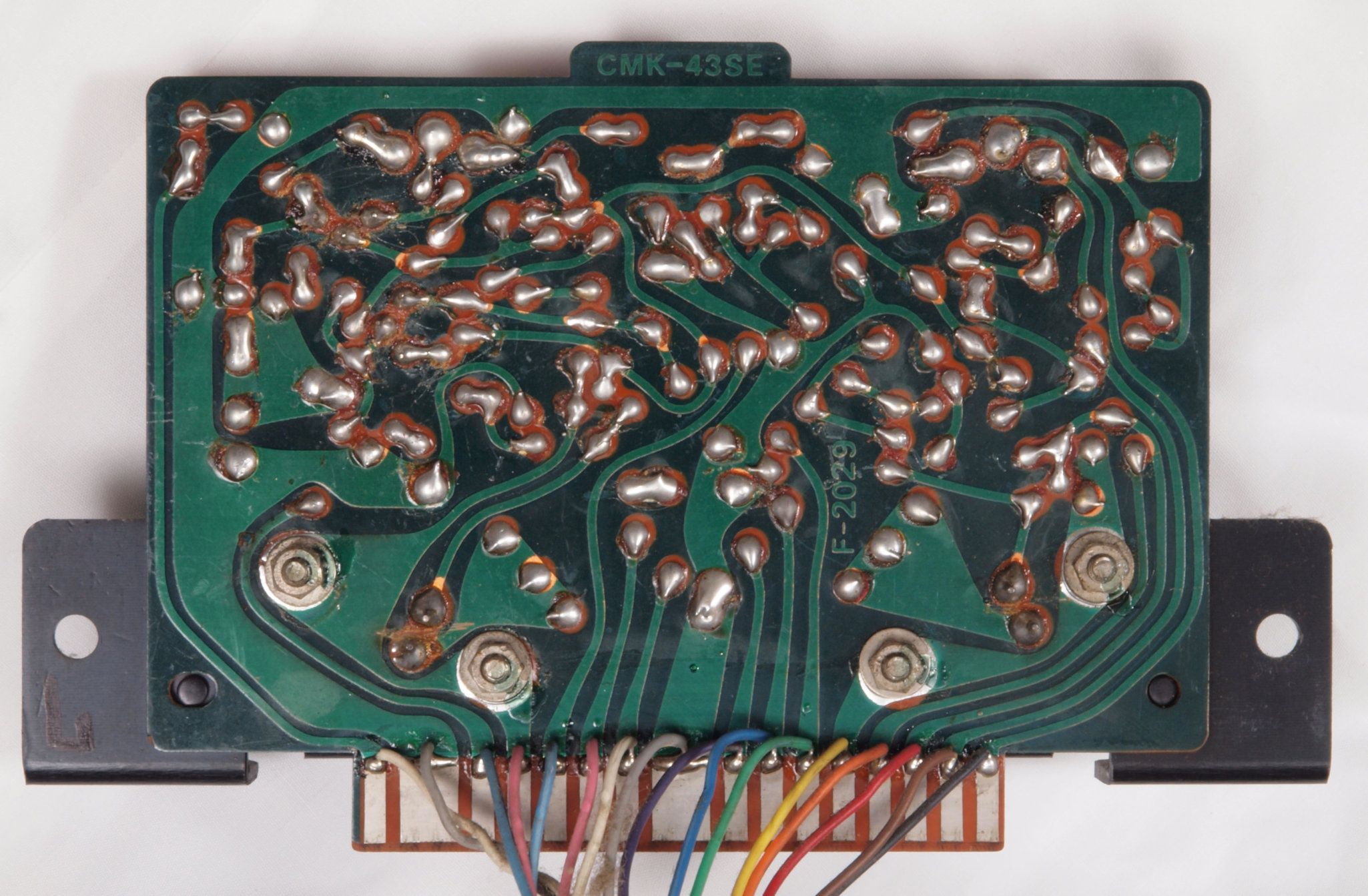 C232. 修理中 R側終段基板裏 コネクターへのバイパス配線半田付け。銅箔が浮いている。当時は定温半田コテは無、腕が悪いと銅箔はく離が生じる。