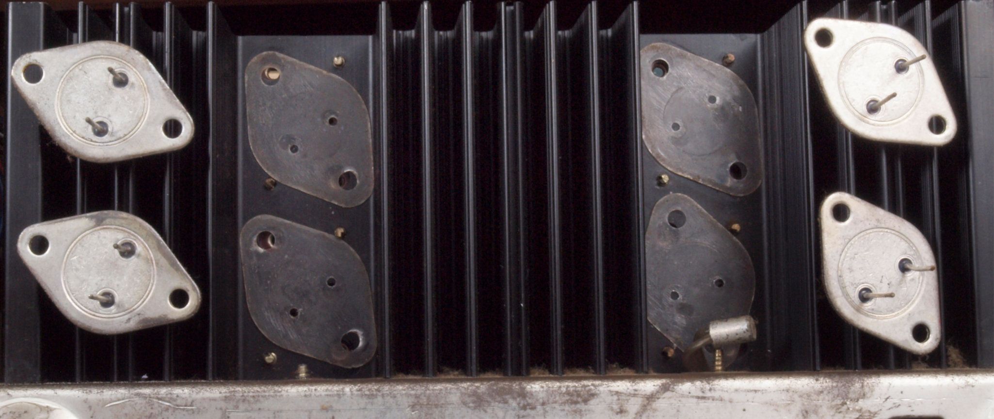 C12. 修理中 R側 終段トランジスター。 熱でシリコングリスが流れ出し殆ど無い、テフロンシートに交換する。
