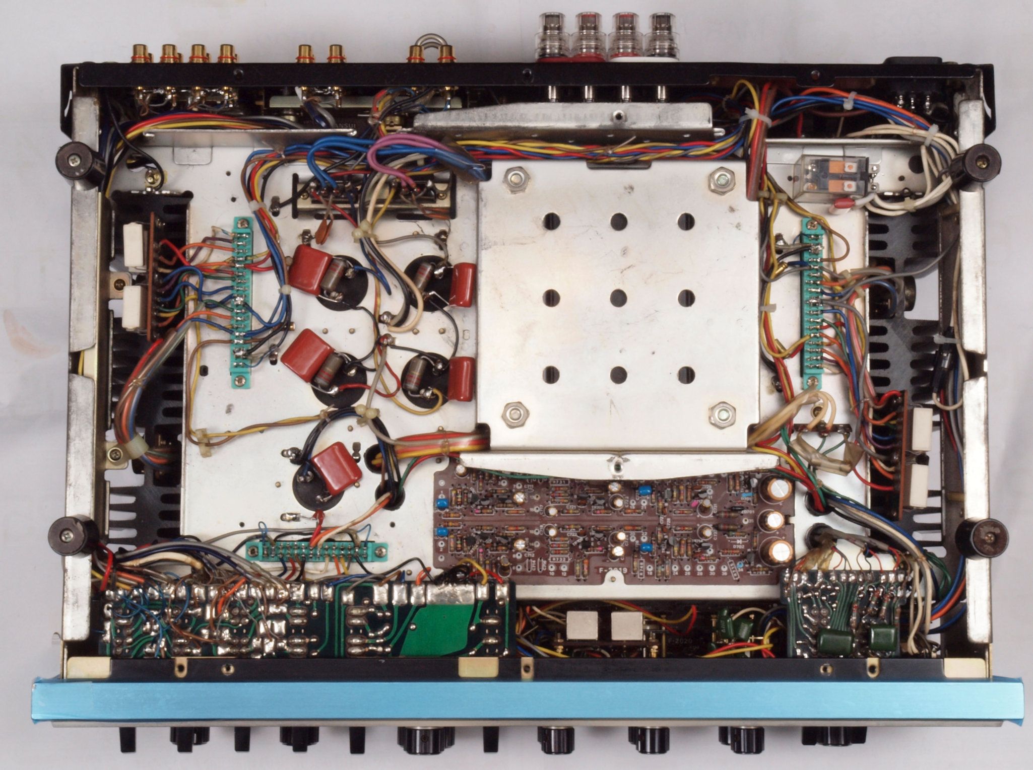 A24. 点検中 上蓋・シールドを取り、上から見る。 電源ブロック電解コンデンサーの頭の膨らみ無。