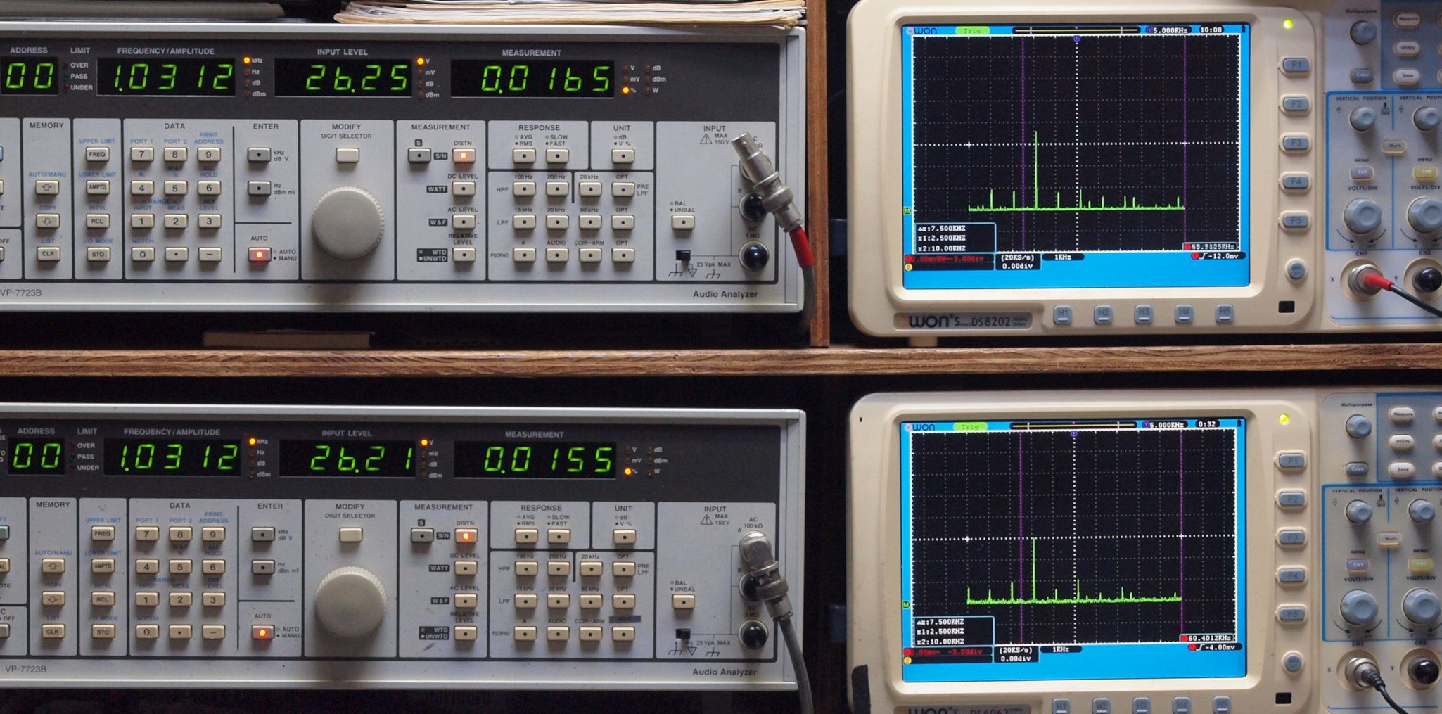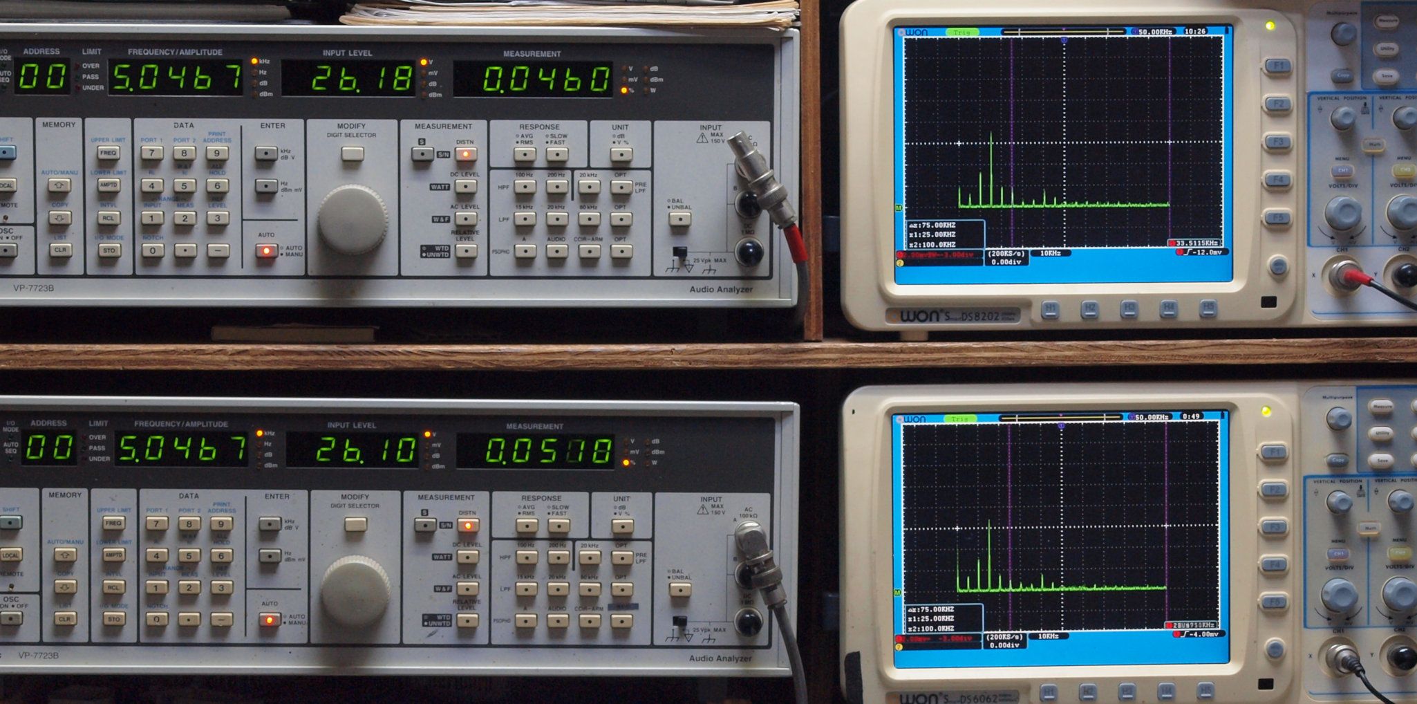 よって、ダイアル設定出力レベルより低くなります。測定機器の仕様や整備の様子はこちら、「VP−7723B」「VP−7201A」。 FFT画面の見方はこちら。