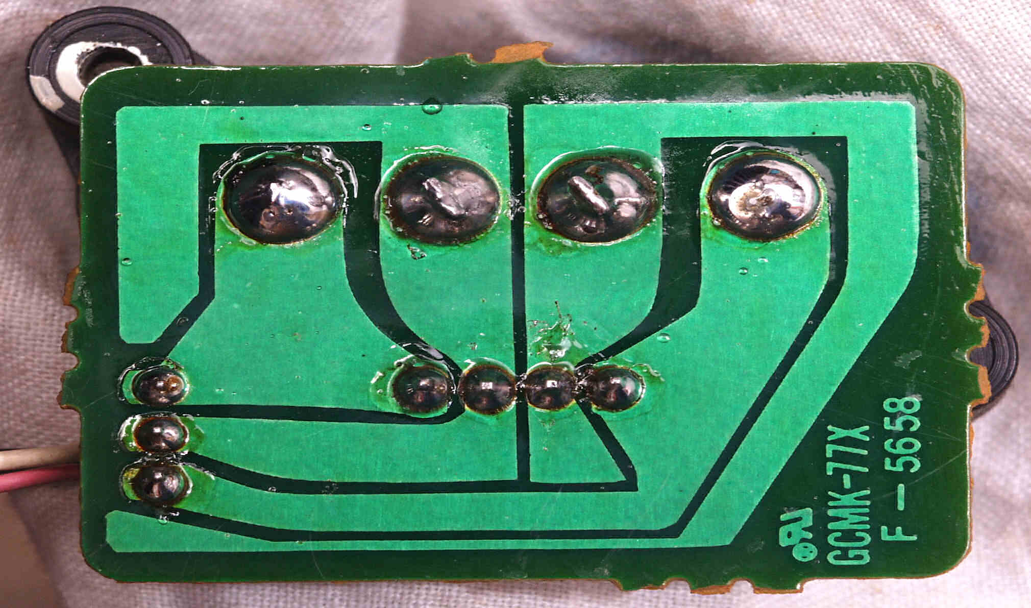 CG4. 修理後(ハンダ補正) 電源基板裏  全ての半田をやり修す、写真では5ヶ所残っているが、この跡補正