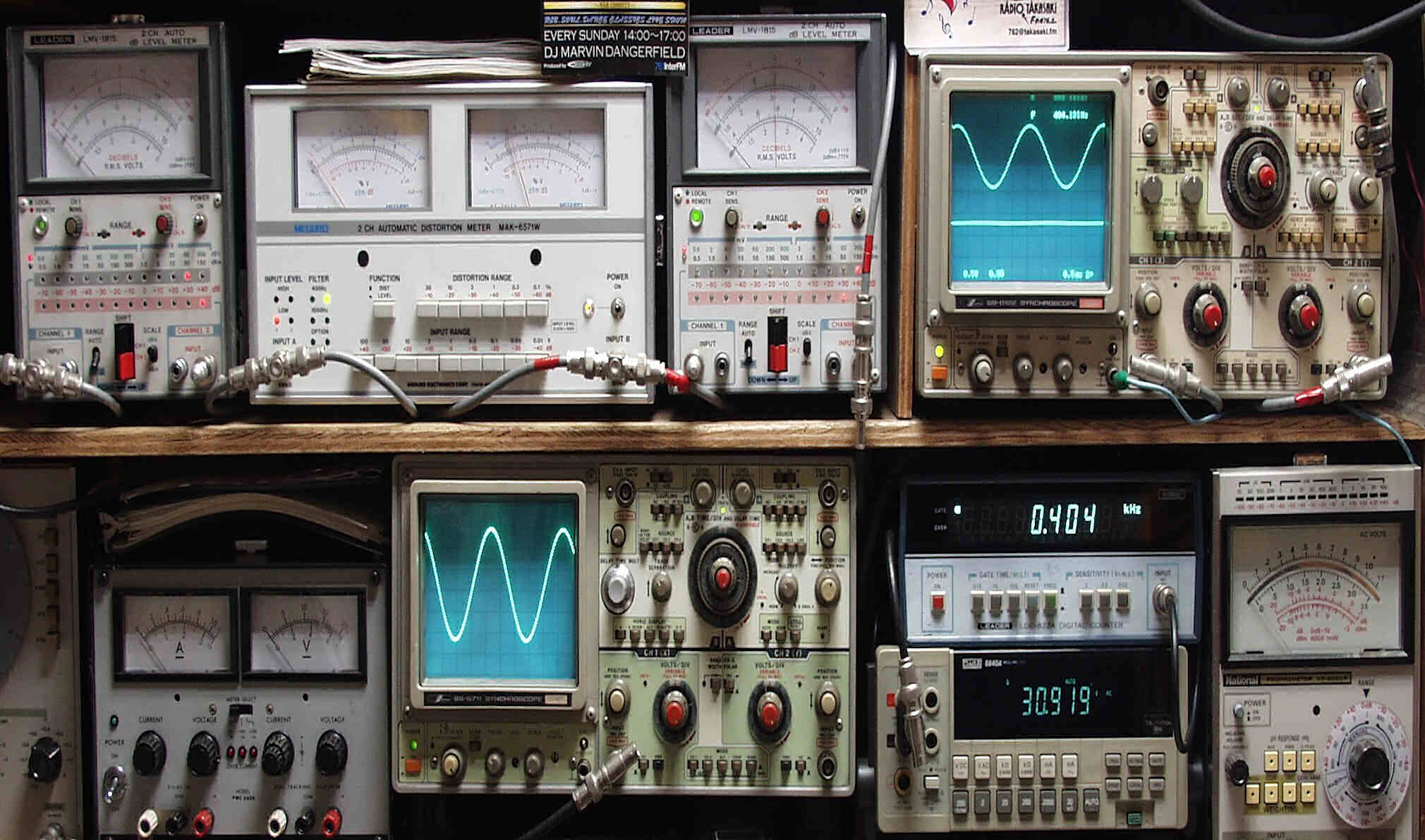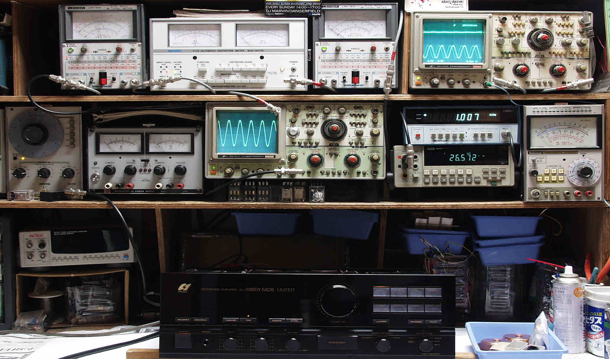 上段中左 歪み率計=SP出力の歪み率測定 左メータ=L出力、右メータ=R出力