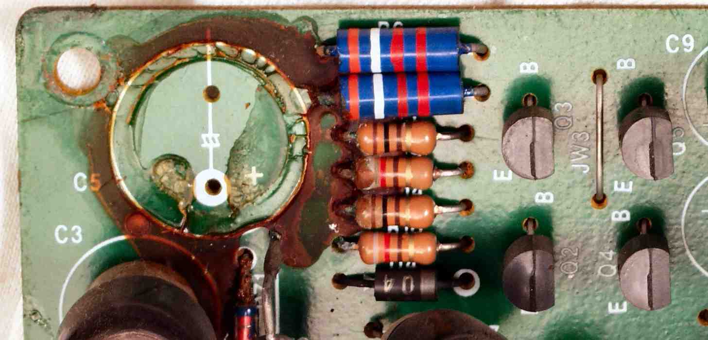 | C1C1. 修理中 R側終段基板。 電解コンデンサー接着剤が抵抗のリード線を腐食している、気長に落とす。 | ||||||||||||||||||||||||||||||||||||||||||||||||||||||||||||