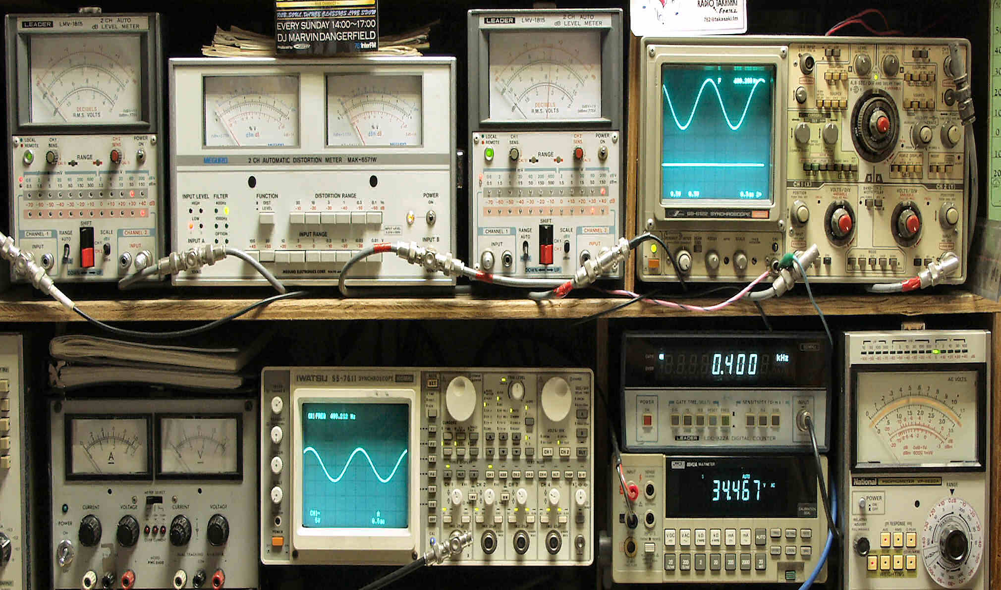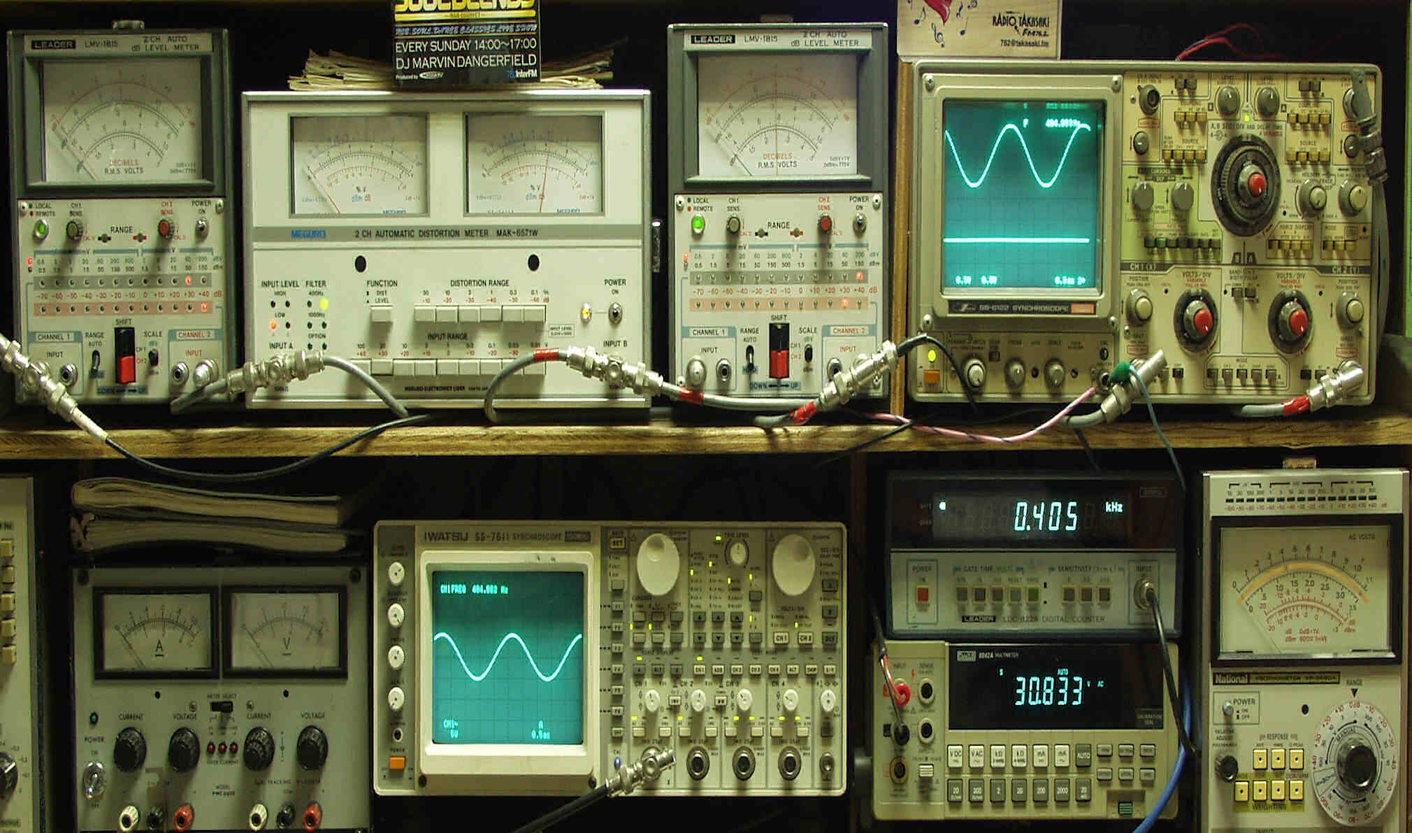 | T. 修理前・測定 T1. 出力/歪み率測定・調整 <見方> 下段左端 オーディオ発振器より400HZ・1KHZの信号を出し(歪み率=約0.003%)これをAMPに入力し、出力を測定 下段中左 オシロ=入力波形(オーディオ発振器のTTLレベル) 下段中右上=周波数計 上段左端 電圧計=L側出力電圧測定、黒針のみ使用 上段中左 歪み率計=出力の歪み率測定 左メータ=L出力、右メータ=R出力 上段中右 電圧計=R側出力電圧測定、赤針のみ使用 上段右端 オシロ=出力波形 上=R出力、下=L出力(実際にはRL電圧計の出力「Max=1V」を観測) 下段中右上 デジタル電圧計=出力電圧測定RLは切り替えて測定 |