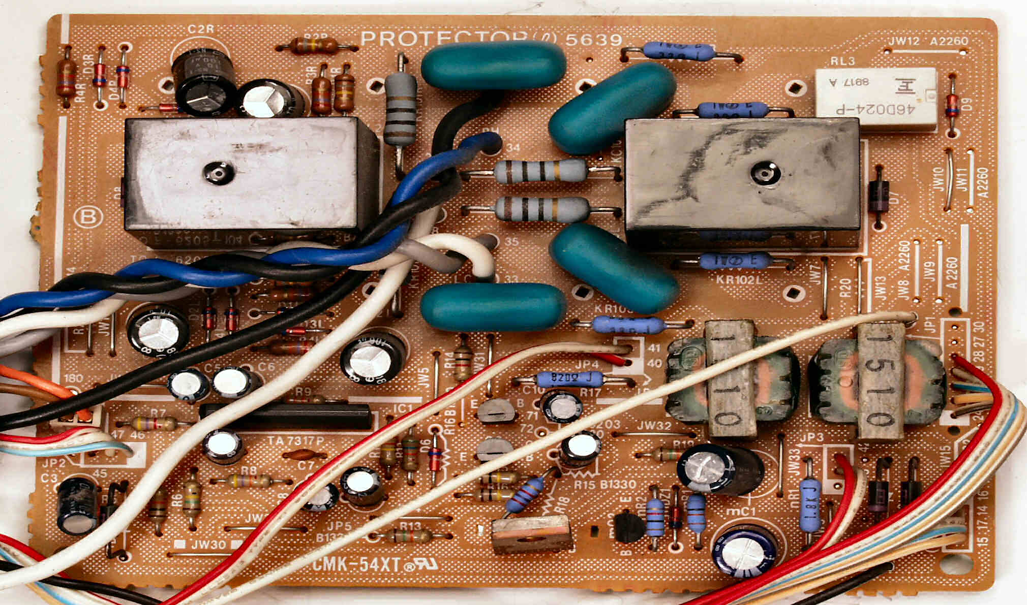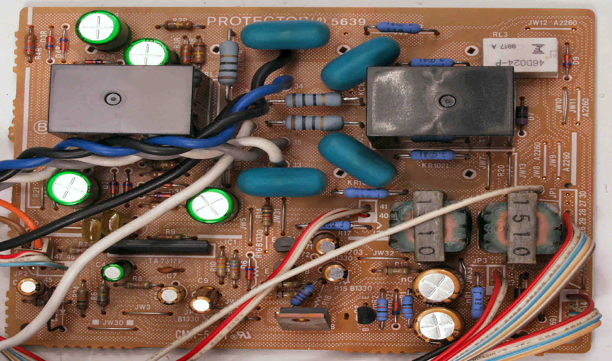| C3D−2. 修理中 SP接続リレー&プロテクト基板裏、 固定されていない中型TR(トランジスター)の足は半田不良になりやすい。 |