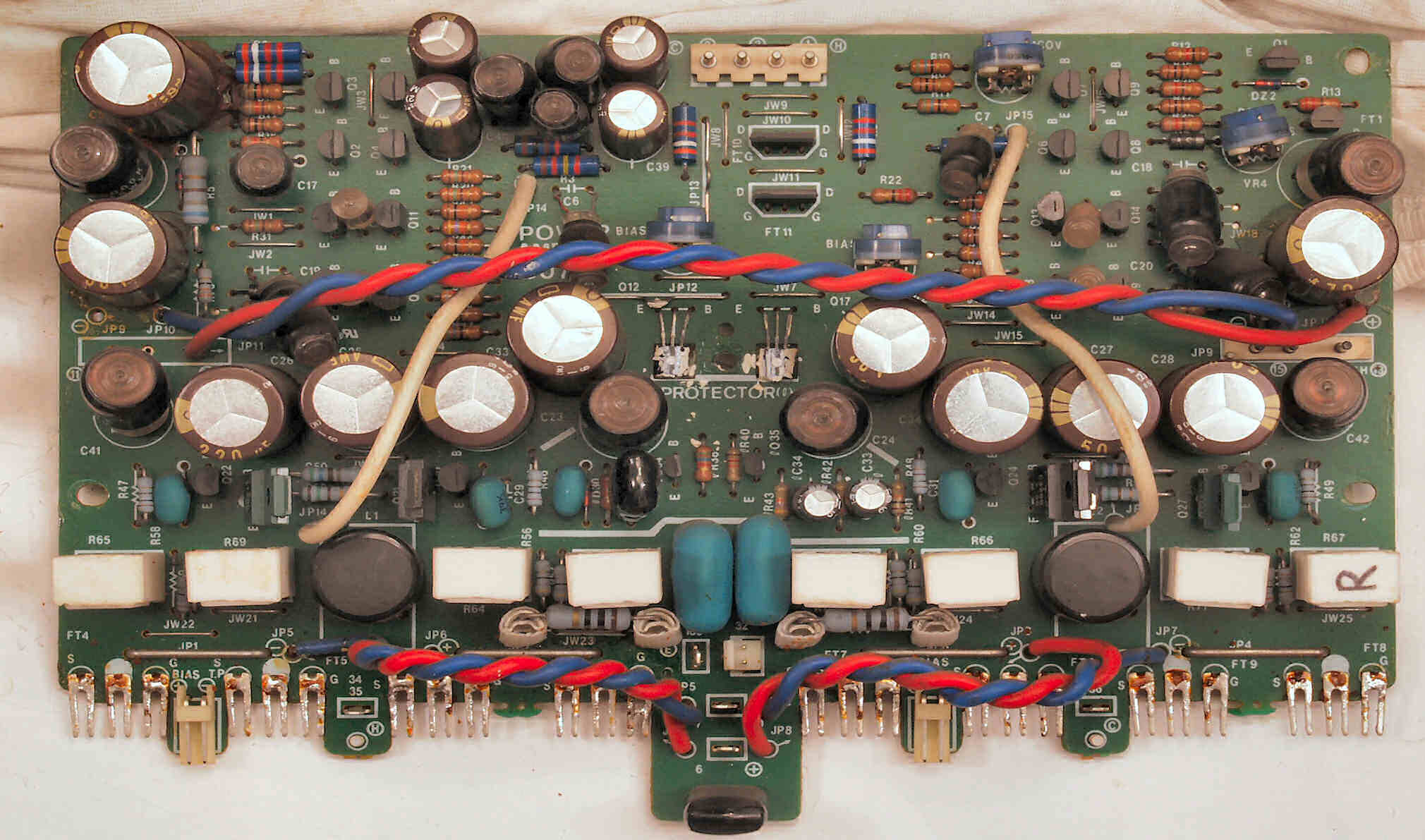 | C1D. 修理後 R側終段基板 初段FET(電界効果トランジスター)2個、半固定VR3個、電解コンデンサー17個交換 カップリング電解コンデンサーはバイポーラー電解コンデンサーに交換したので個数減少 |