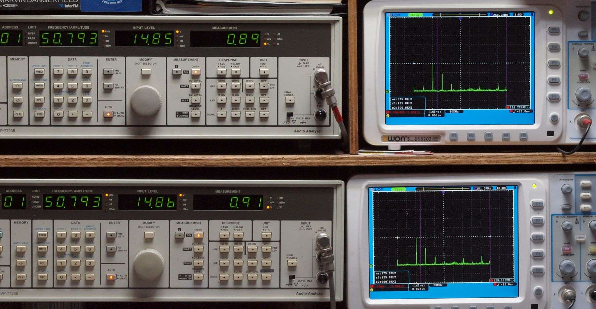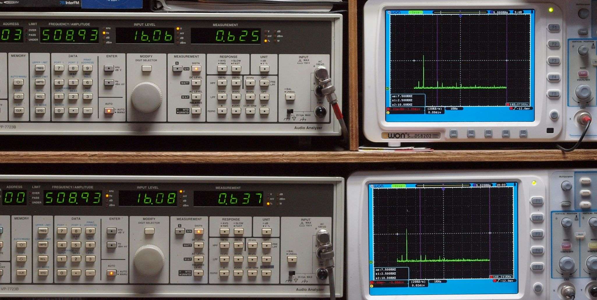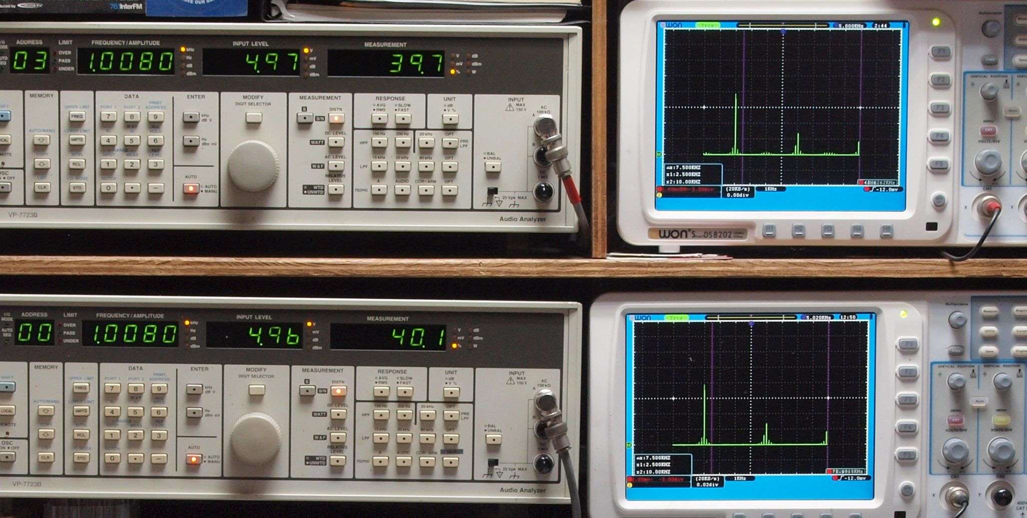 | E. 測定・調整 E1. 出力・歪み率測定・調整 「見方」。 上段中 右側SP出力を「Audio Analyzer Panasonic VP−7723B」により測定。 表示LED、 左端=メモリーNo、 中左=周波数測定、 中右=出力電圧測定、 右端=歪み率測定。 上段右端 VP−7723Bの基本波除去出力を「owon SDS8202(200MHZ)」で「FFT分析」表示。 下段中 左側SP出力を「Audio Analyzer Panasonic VP−7723B」により測定。 表示LED、 左端=メモリーNo、 中左=周波数測定、 中右=出力電圧測定、 右端=歪み率測定。 下段右端 VP−7723Bの基本波除去出力を「owon SDS6062(200MHZ)」で「FFT分析」表示。 下段左端 オーディオ発振器 VP−7201A より50Hz〜100kHzの信号を出し(歪み率=約0.003%)、ATT+分配器を通し、AMPに入力。 よって、ダイアル設定出力レベルより低くなります。測定機器の仕様や整備の様子はこちら、「VP−7723B」「VP−7201A」。 FFT画面の見方はこちら。 |
