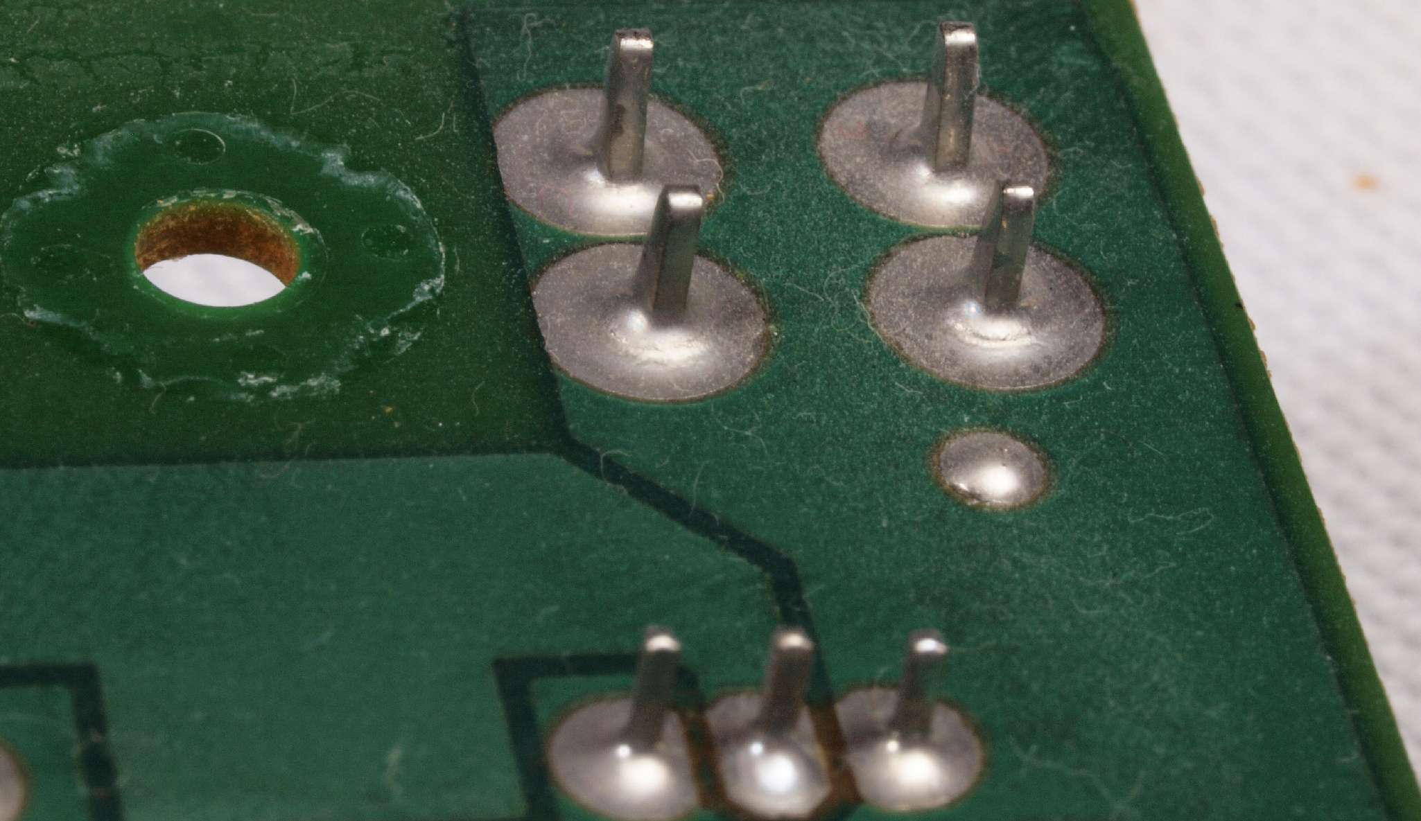 | C132. 修理中 右側終段AMP基板裏。 半田不良ケ所。 ストロボの光線を水平に照射して、割れ目が見やすくして撮影。 | ||||||||||||||||||||||||||||||||||||||