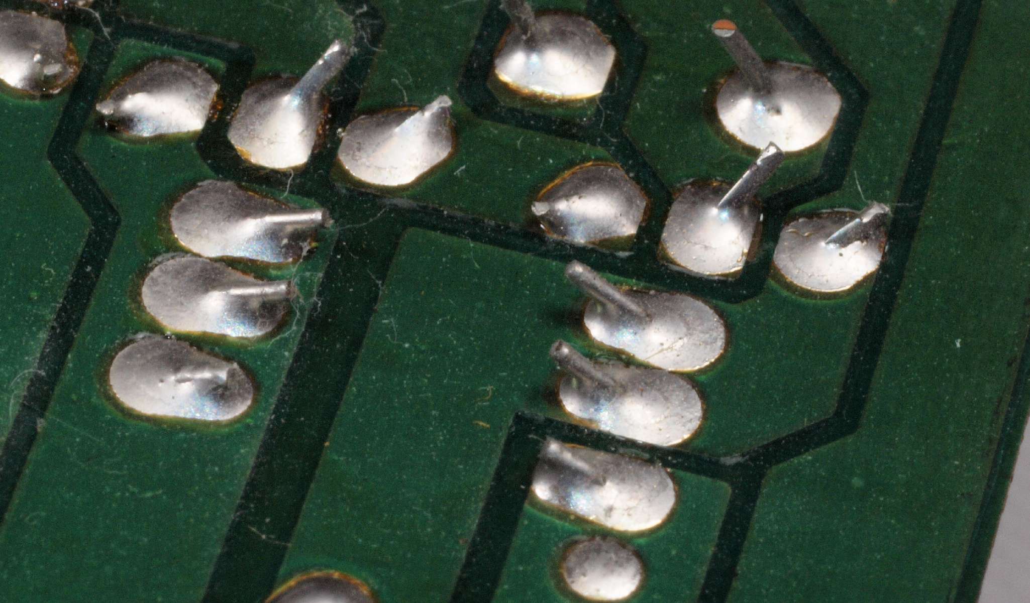| C232. 修理中 左側終段AMP基板裏。 半田不良ケ所。 ストロボの光線を水平に照射して、割れ目が見やすくして撮影。 | ||||||||||||||||||||||||||||||||||||||