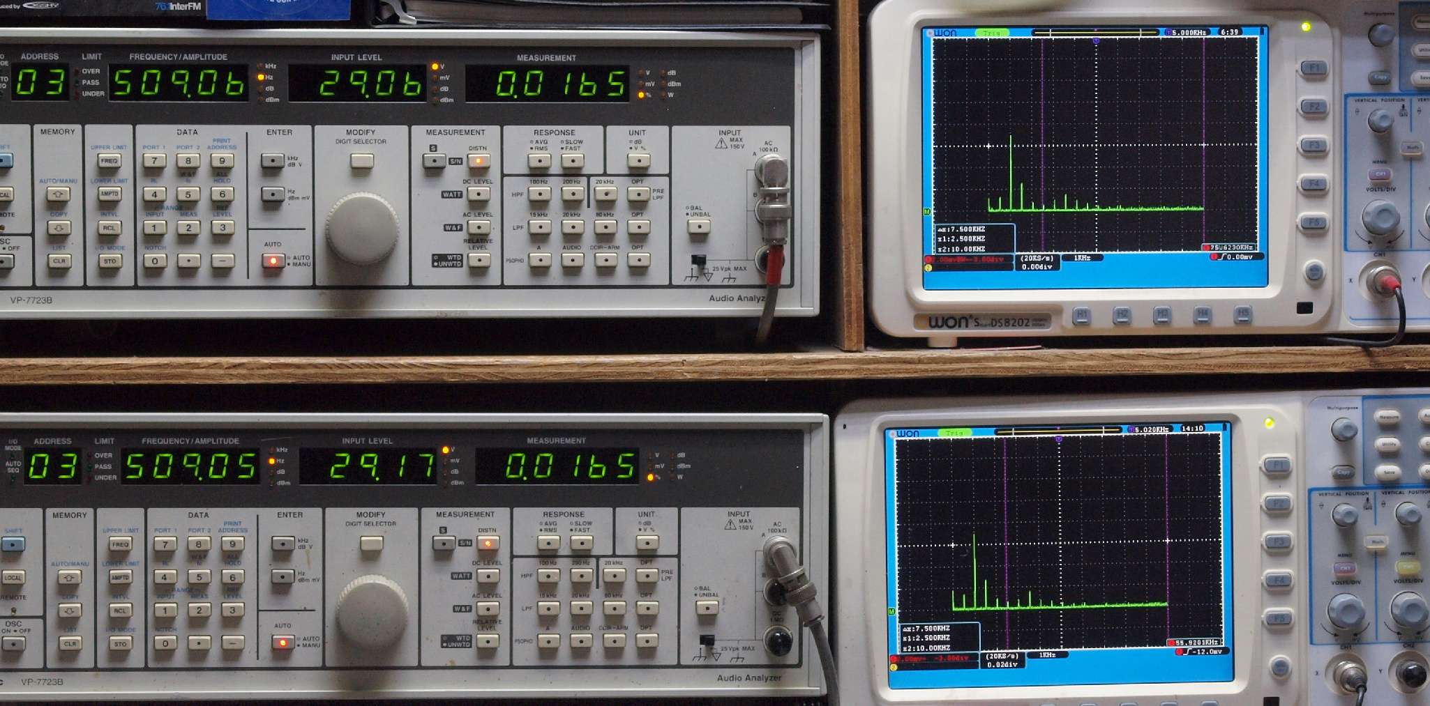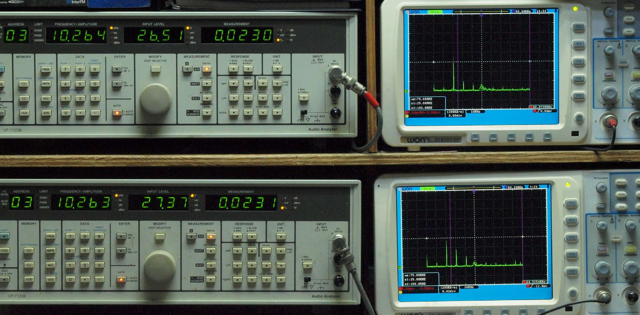 | E. 測定・調整。 画像をクリックすると、大きく(横幅2050ドット)表示されます。 E0. 出力・歪み率測定・調整 「見方」。 上段中 右側SP出力を「Audio Analyzer Panasonic VP−7723B」により測定。 表示LED、 左端=メモリーNo、 中左=周波数測定、 中右=出力電圧測定、 右端=歪み率測定。 上段右端 VP−7723Bの基本波除去出力を「owon SDS8202(200MHZ)」で「FFT分析」表示。 下段中 左側SP出力を「Audio Analyzer Panasonic VP−7723B」により測定。 表示LED、 左端=メモリーNo、 中左=周波数測定、 中右=出力電圧測定、 右端=歪み率測定。 下段右端 VP−7723Bの基本波除去出力を「owon SDS6062(200MHZ)」で「FFT分析」表示。 下段左端 オーディオ発振器 VP−7201A より50Hz〜100kHzの信号を出し(歪み率=約0.003%)、ATT+分配器を通し、AMPに入力。 よって、ダイアル設定出力レベルより低くなります。測定機器の仕様や整備の様子はこちら、「VP−7723B」「VP−7201A」。 FFT画面の見方はこちら。 |