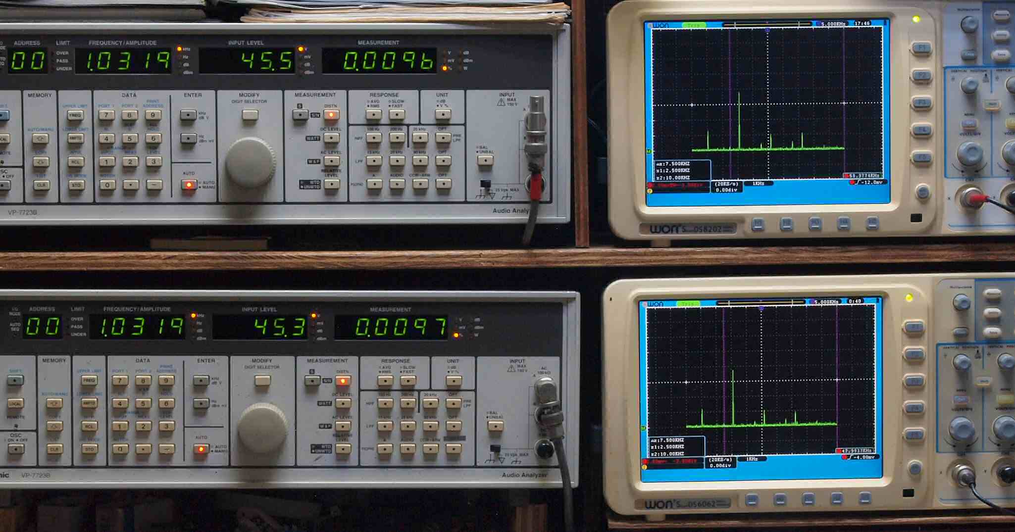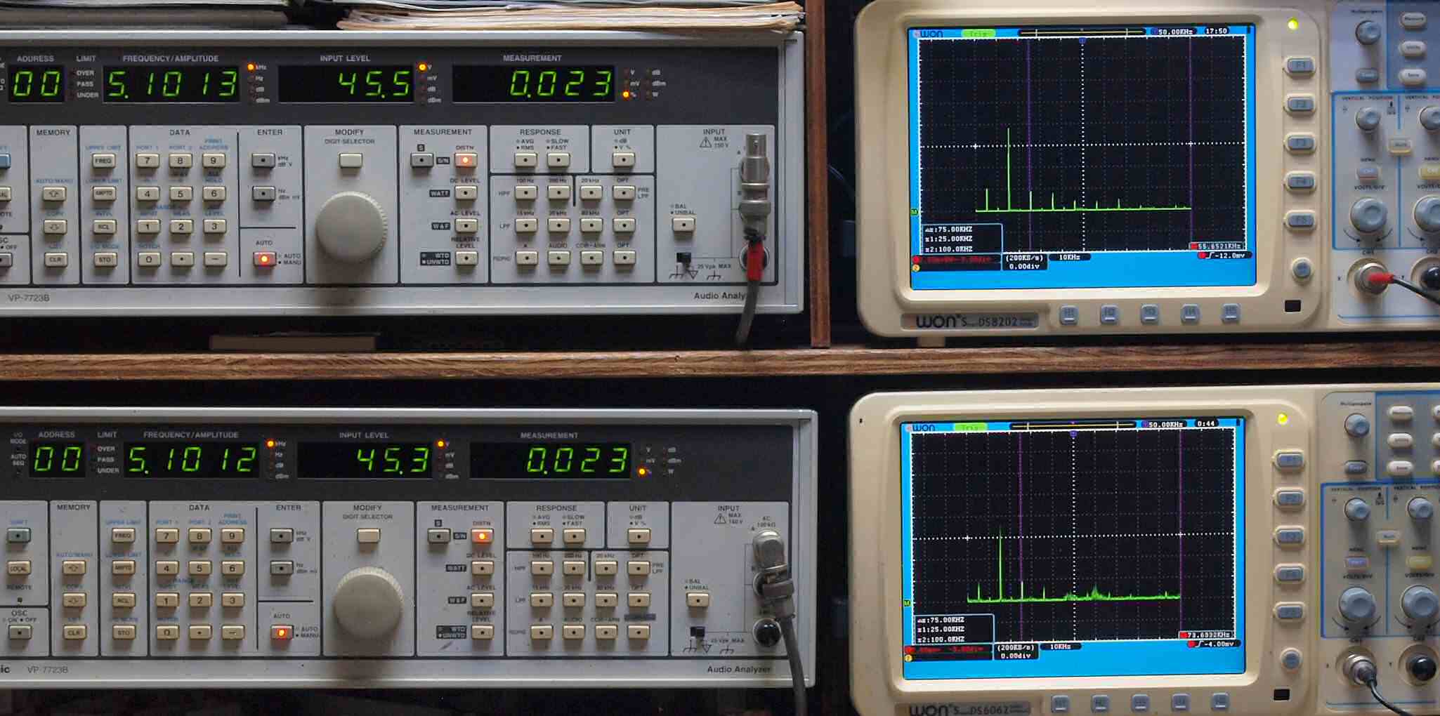 | E. 測定・調整。 画像をクリックすると、大きく(横幅2050ドット)表示されます。 E0. 出力・歪み率測定・調整 「見方」。 上段中 右側SP出力を「Audio Analyzer Panasonic VP−7723B」により測定。 表示LED、 左端=メモリーNo、 中左=周波数測定、 中右=出力電圧測定、 右端=歪み率測定。 上段右端 VP−7723Bの基本波除去出力を「owon SDS8202(200MHZ)」で「FFT分析」表示。 下段中 左側SP出力を「Audio Analyzer Panasonic VP−7723B」により測定。 表示LED、 左端=メモリーNo、 中左=周波数測定、 中右=出力電圧測定、 右端=歪み率測定。 下段右端 VP−7723Bの基本波除去出力を「owon SDS6062(200MHZ)」で「FFT分析」表示。 下段左端 オーディオ発振器 VP−7201A より50Hz〜100kHzの信号を出し(歪み率=約0.003%)、ATT+分配器を通し、AMPに入力。 よって、ダイアル設定出力レベルより低くなります。測定機器の仕様や整備の様子はこちら、「VP−7723B」「VP−7201A」。 FFT画面の見方はこちら。 |