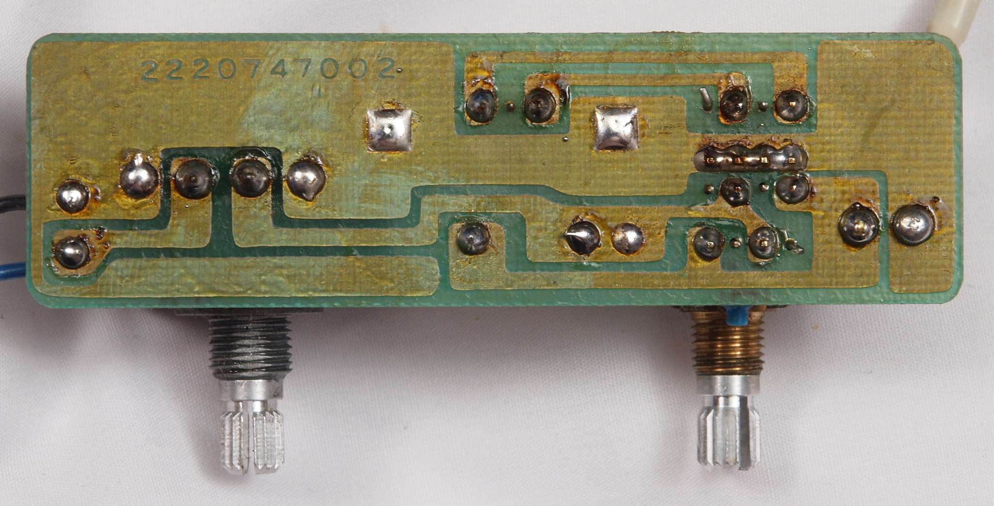 | C1G. 修理中 +−側終段AMP基板。 ジャンパー線、電解コンデンサーの足が腐食している。 | ||||||||||||||||||||||||||||||||||||||||||||||||||||||||