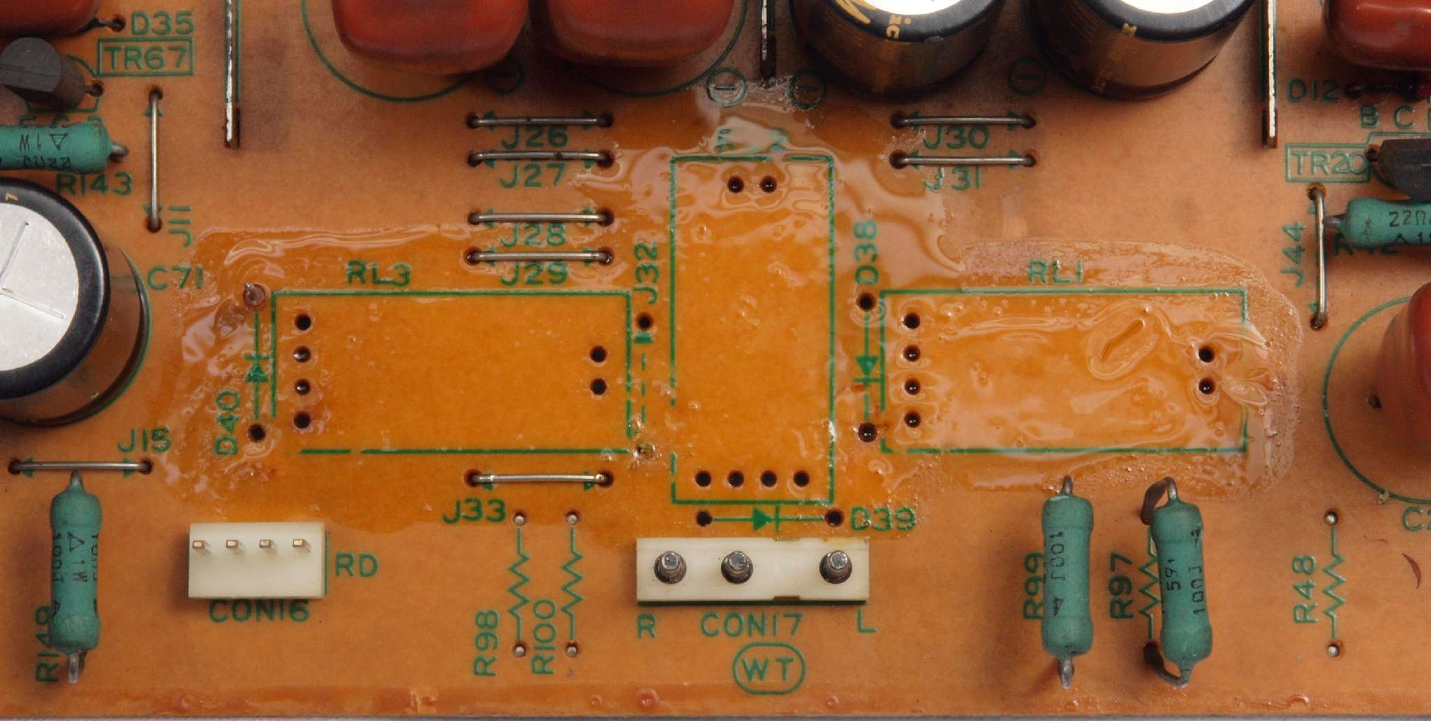 | C413. 修理中 電源・コントロール、リレー基板。 トルエン溶媒の接着剤を取り去り、コートを塗布後。 | ||||||||||||||||||||||||||||||||||||||||||||||||||||||||