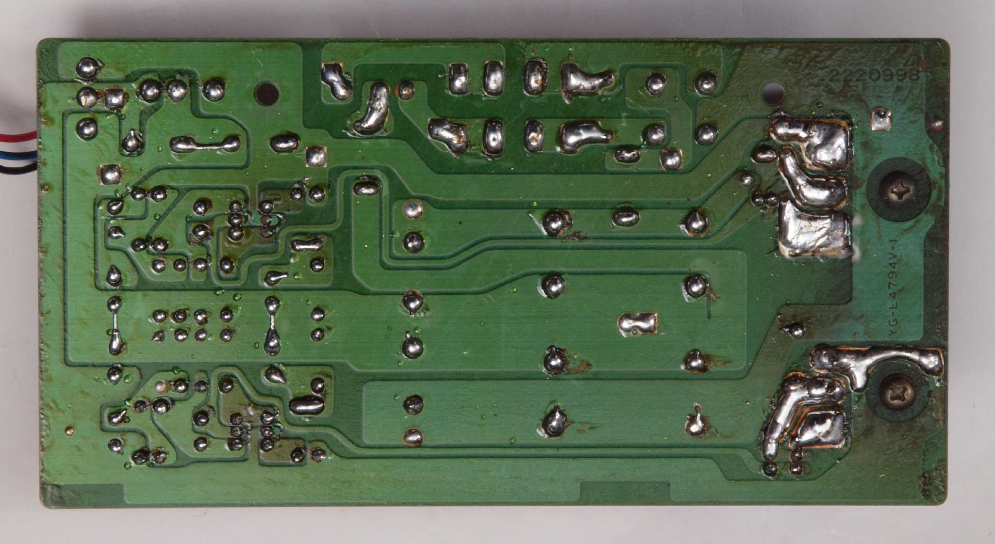 | C335. 修理中 電源・コントロール基板裏。 曲げる方向が悪く隣の銅箔に? | ||||||||||||||||||||||||||||||||||||||||||||||||||||||||