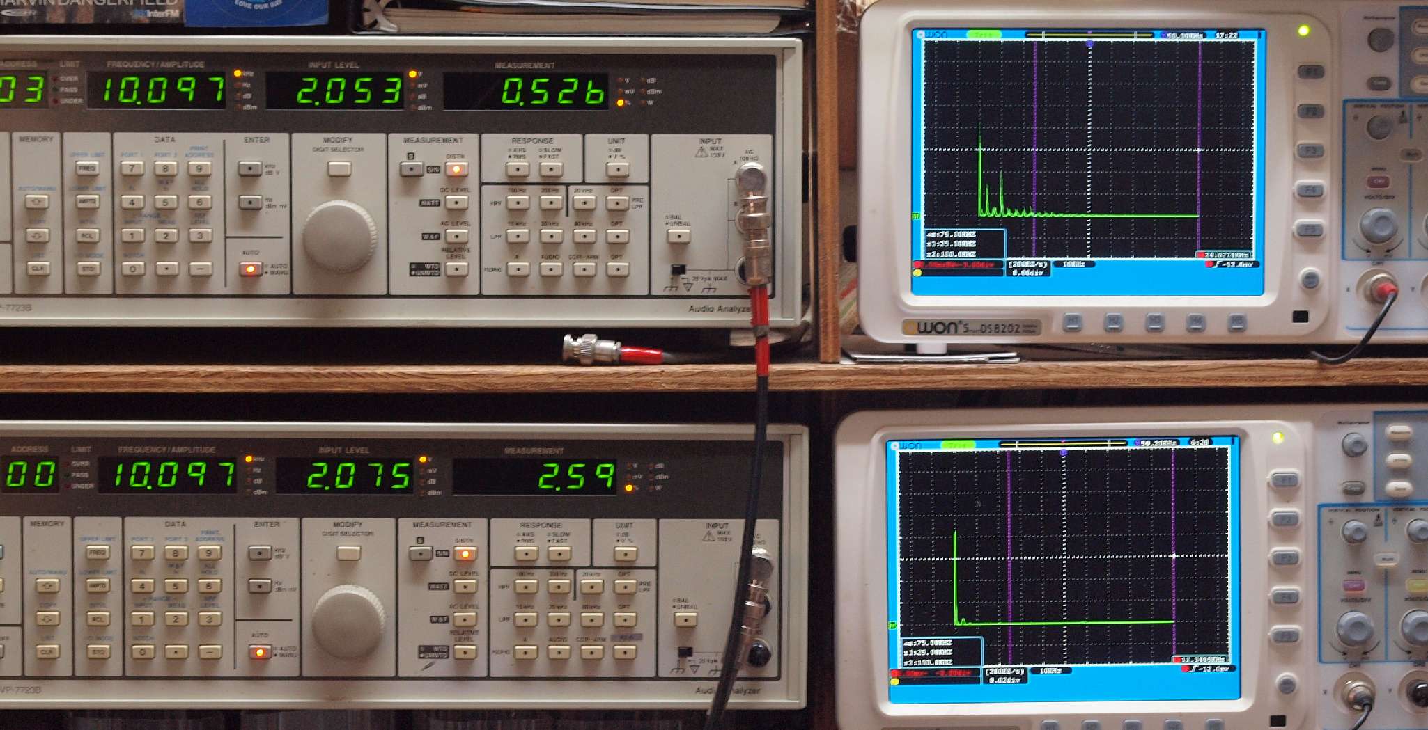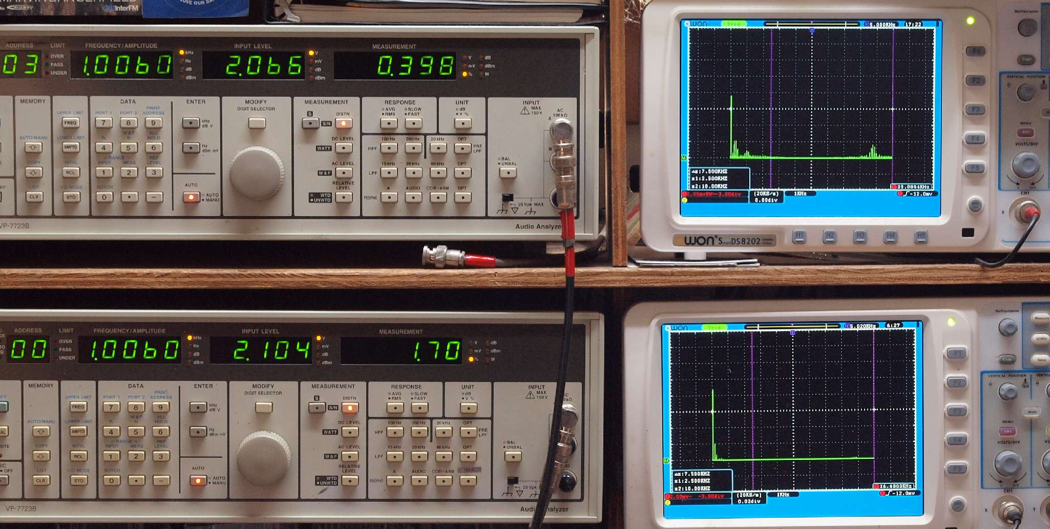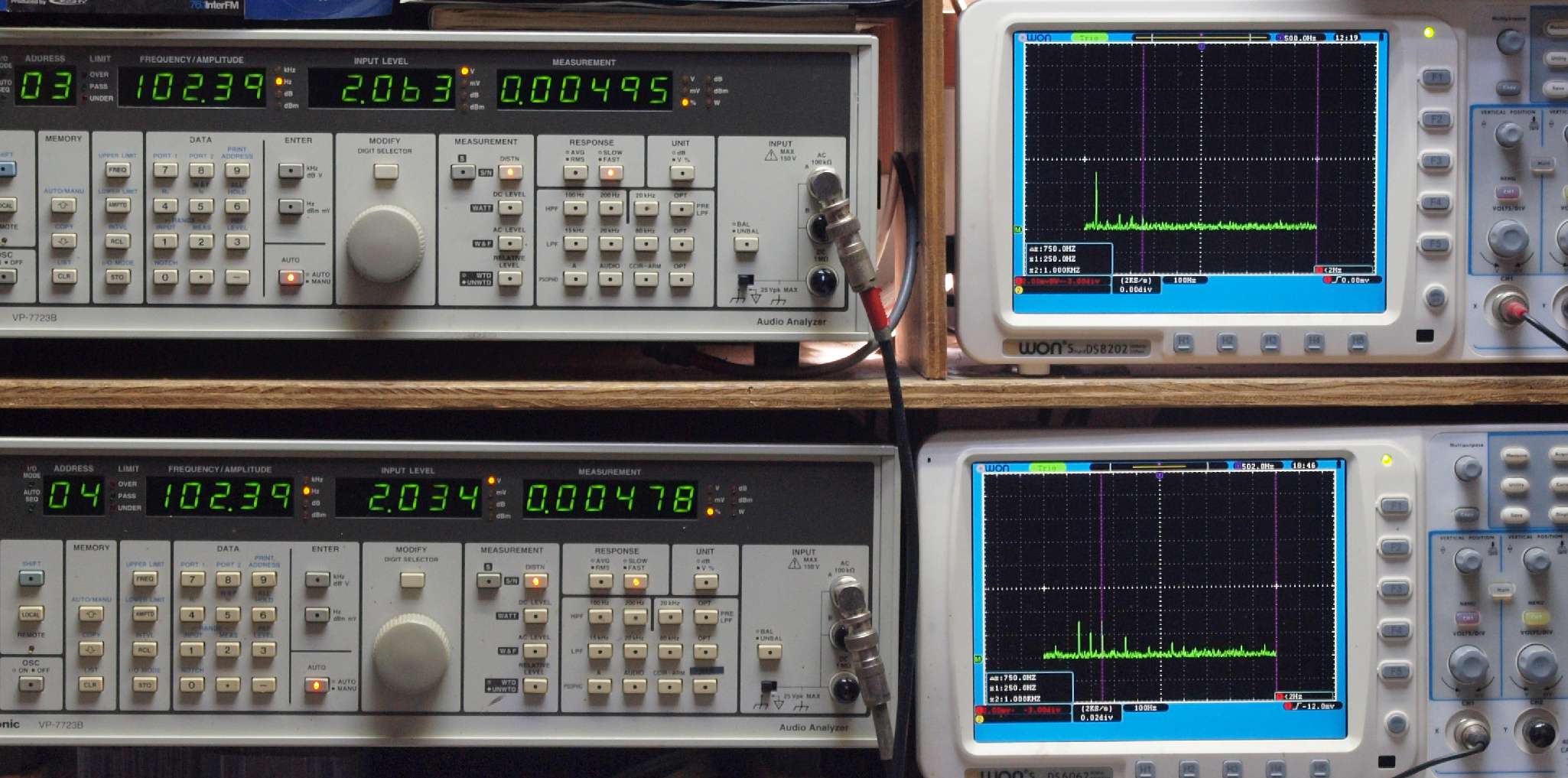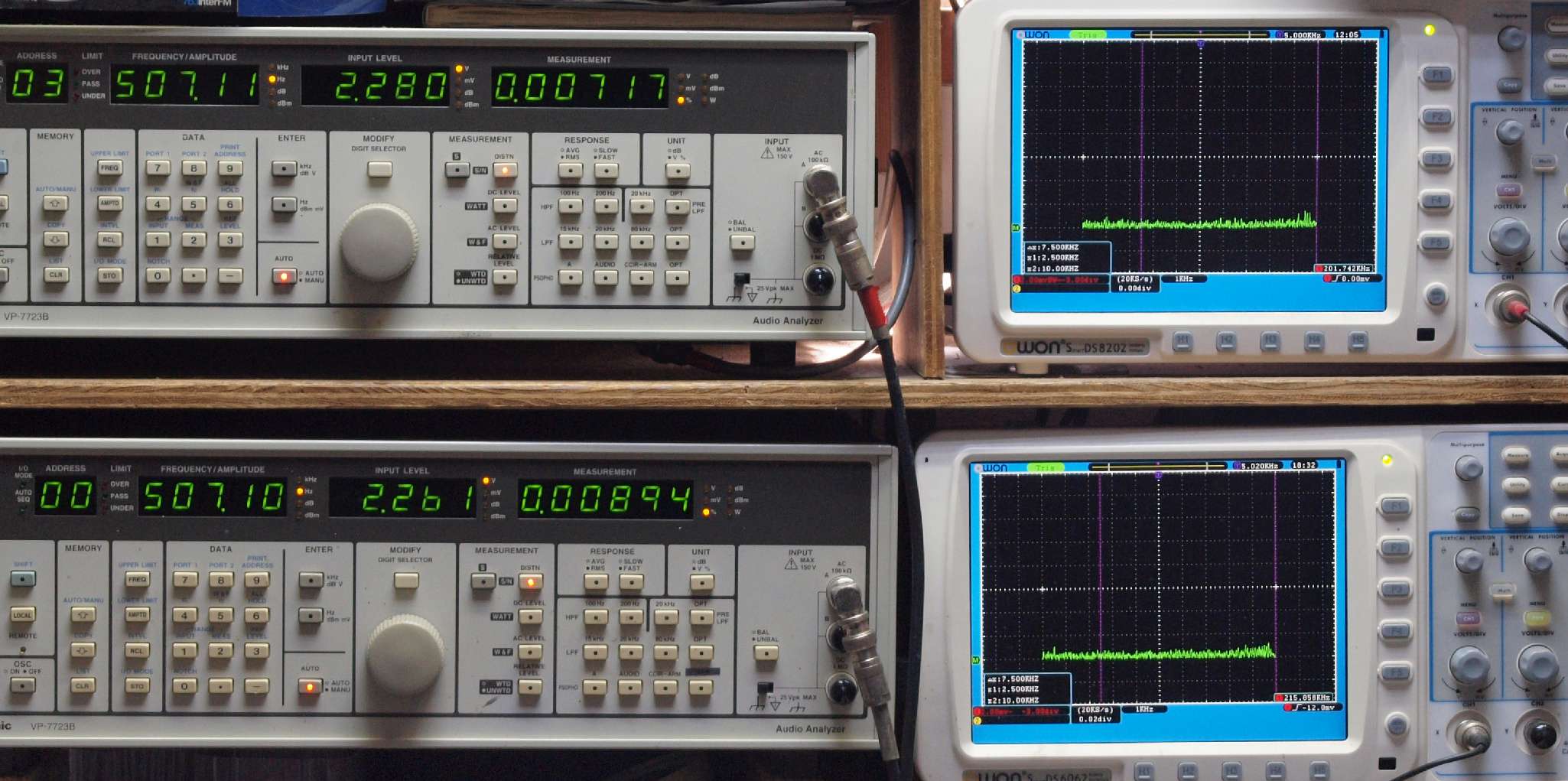 | E. 調整・測定。 画像をクリックすると、大きく(横幅2050ドット)表示されます。 E0. 出力・歪み率測定・調整。 「見方」。 上段中 右側SP出力を「Audio Analyzer Panasonic VP−7723B」により測定。 表示LED、 左端=メモリーNo、 中左=周波数測定、 中右=出力電圧測定、 右端=歪み率測定。 上段右端 VP−7723Bの基本波除去出力を「owon SDS8202(200MHZ)」で「FFT分析」表示。 下段中 左側SP出力を「Audio Analyzer Panasonic VP−7723B」により測定。 表示LED、 左端=メモリーNo、 中左=周波数測定、 中右=出力電圧測定、 右端=歪み率測定。 下段右端 VP−7723Bの基本波除去出力を「owon SDS6062(200MHZ)」で「FFT分析」表示。 下段左端 オーディオ発振器 VP−7201A より50Hz〜100kHzの信号を出し(歪み率=約0.003%)、ATT+分配器を通し、AMPに入力。 よって、ダイアル設定出力レベルより低くなります。測定機器の仕様や整備の様子はこちら、「VP−7723B」「VP−7201A」。 FFT画面の見方はこちら。 |