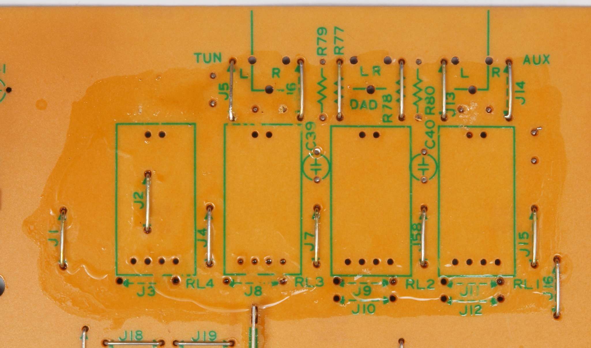 | C13. 修理前 EQ−HEAD-AMP基板裏。 RCA端子が半田補正してある。 | ||||||||||||||||||||||||||||||||||||||||||||||||||||