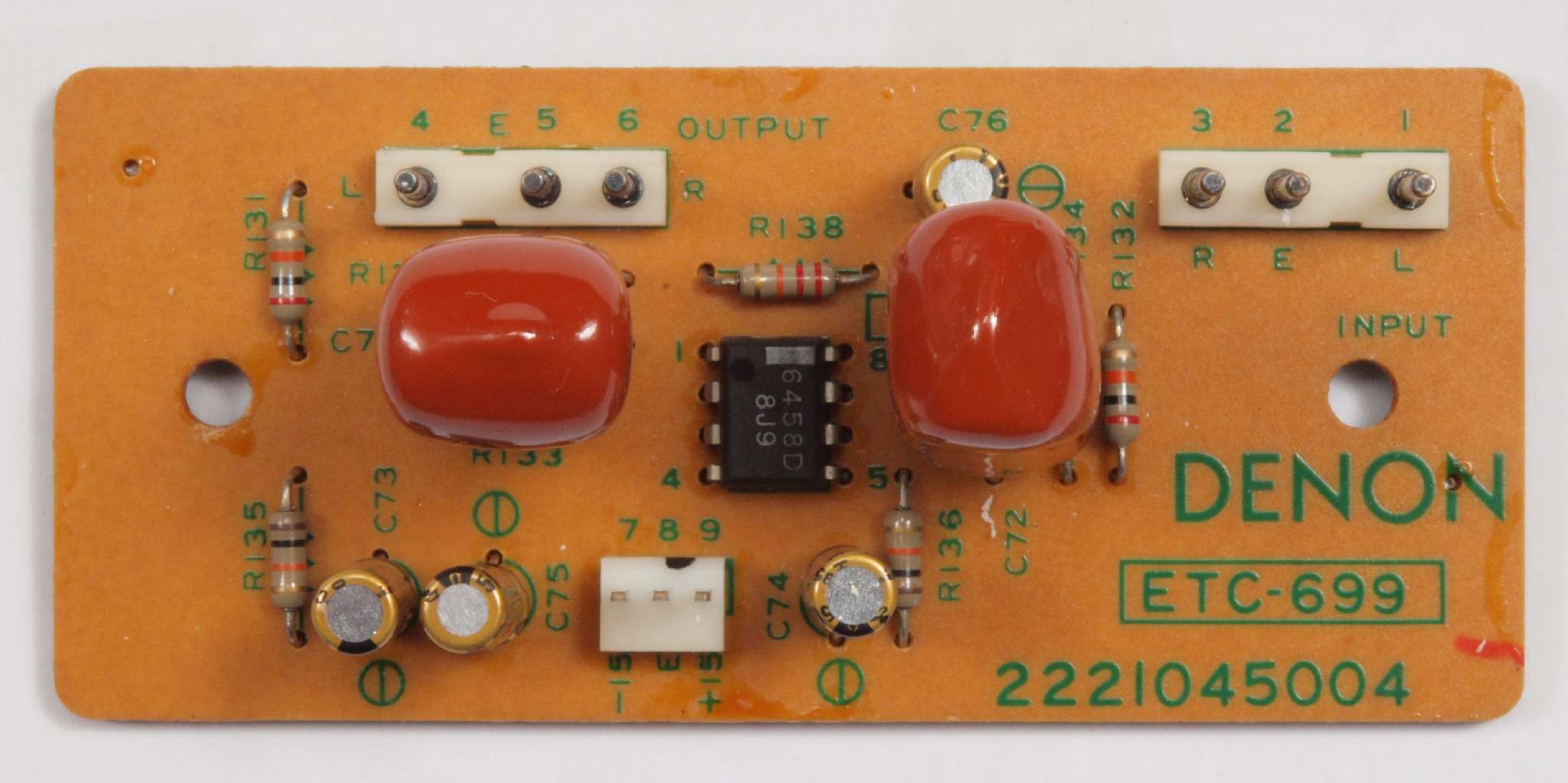 | C114. 修理中 EQ−HEAD-AMP基板。 フイルムコンデンサー(高域補正)の足の差し込みが不十分で、半田が無。 MCトランス使用のMC入力(Phono−1)なので、トランスの特性のお陰で、RLの差が僅差で解らなかったかも? |