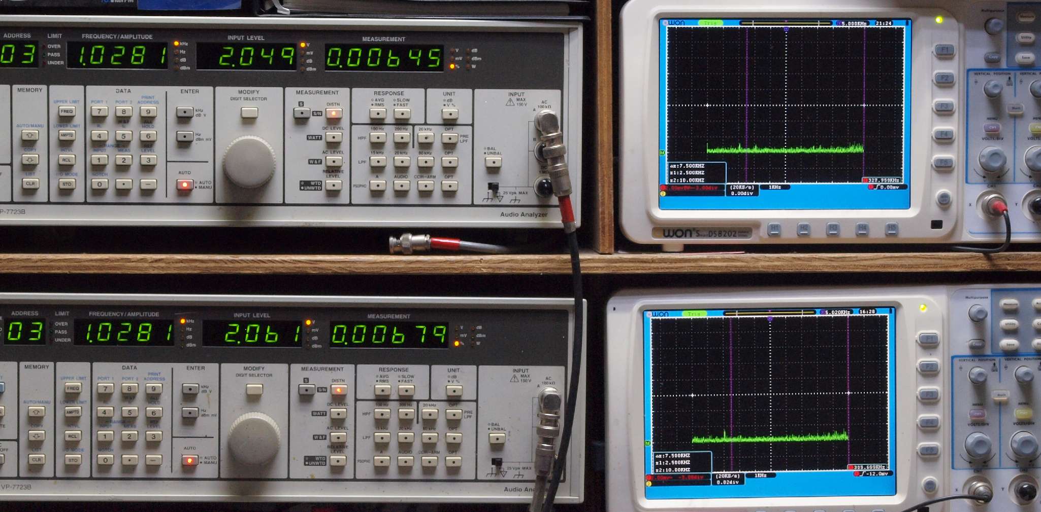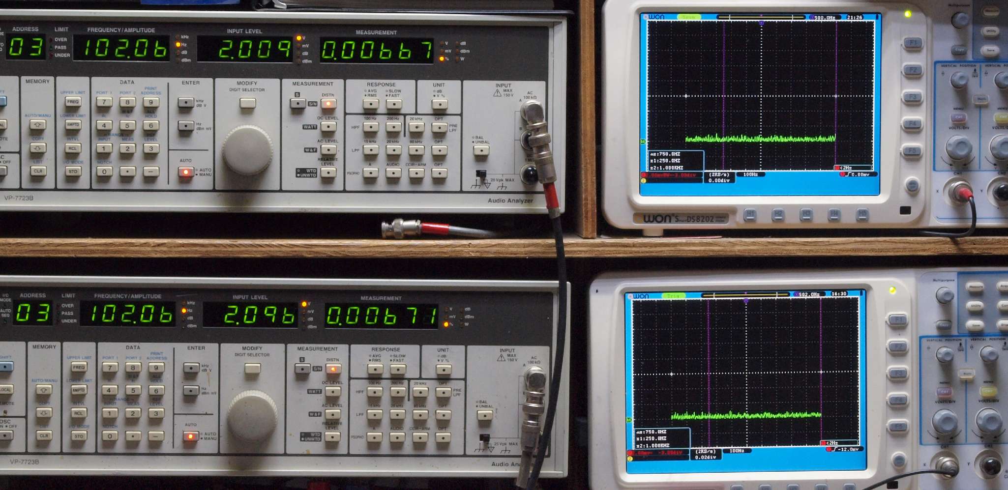 | E. 調整・測定。 画像をクリックすると、大きく(横幅2050ドット)表示されます。 E0. 出力・歪み率測定・調整。 「見方」。 上段中 右側SP出力を「Audio Analyzer Panasonic VP−7723B」により測定。 表示LED、 左端=メモリーNo、 中左=周波数測定、 中右=出力電圧測定、 右端=歪み率測定。 上段右端 VP−7723Bの基本波除去出力を「owon SDS8202(200MHZ)」で「FFT分析」表示。 下段中 左側SP出力を「Audio Analyzer Panasonic VP−7723B」により測定。 表示LED、 左端=メモリーNo、 中左=周波数測定、 中右=出力電圧測定、 右端=歪み率測定。 下段右端 VP−7723Bの基本波除去出力を「owon SDS6062(200MHZ)」で「FFT分析」表示。 下段左端 オーディオ発振器 VP−7201A より50Hz〜100kHzの信号を出し(歪み率=約0.003%)、ATT+分配器を通し、AMPに入力。 よって、ダイアル設定出力レベルより低くなります。測定機器の仕様や整備の様子はこちら、「VP−7723B」「VP−7201A」。 FFT画面の見方はこちら。 |