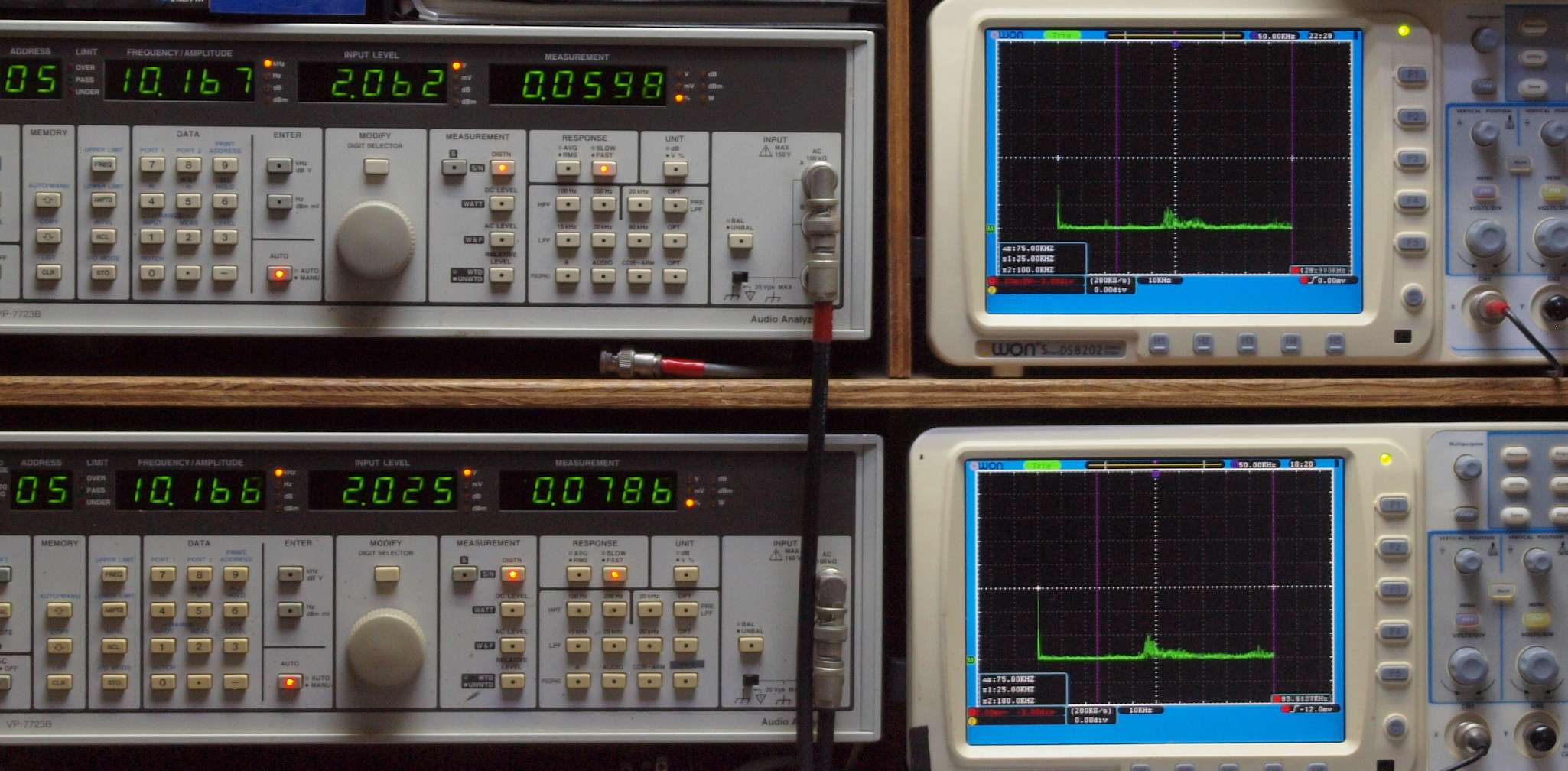 | E. 調整・測定。 画像をクリックすると、大きく(横幅2050ドット)表示されます。 E0. 出力・歪み率測定・調整。 「見方」。 上段中 右側出力を「Audio Analyzer Panasonic VP−7723B」により測定。 表示LED、 左端=メモリーNo、 中左=周波数測定、 中右=出力電圧測定、 右端=歪み率測定。 上段右端 VP−7723Bの基本波除去出力を「owon SDS8202(200MHZ)」で「FFT分析」表示。 下段中 左側出力を「Audio Analyzer Panasonic VP−7723B」により測定。 表示LED、 左端=メモリーNo、 中左=周波数測定、 中右=出力電圧測定、 右端=歪み率測定。 下段右端 VP−7723Bの基本波除去出力を「owon SDS6062(200MHZ)」で「FFT分析」表示。 下段左端 オーディオ発振器 VP−7201A より50Hz〜100kHzの信号を出し(歪み率=約0.003%)、ATT+分配器を通し、AMPに入力。 よって、ダイアル設定出力レベルより低くなります。測定機器の仕様や整備の様子はこちら、「VP−7723B」「VP−7201A」。 FFT画面の見方はこちら。 |