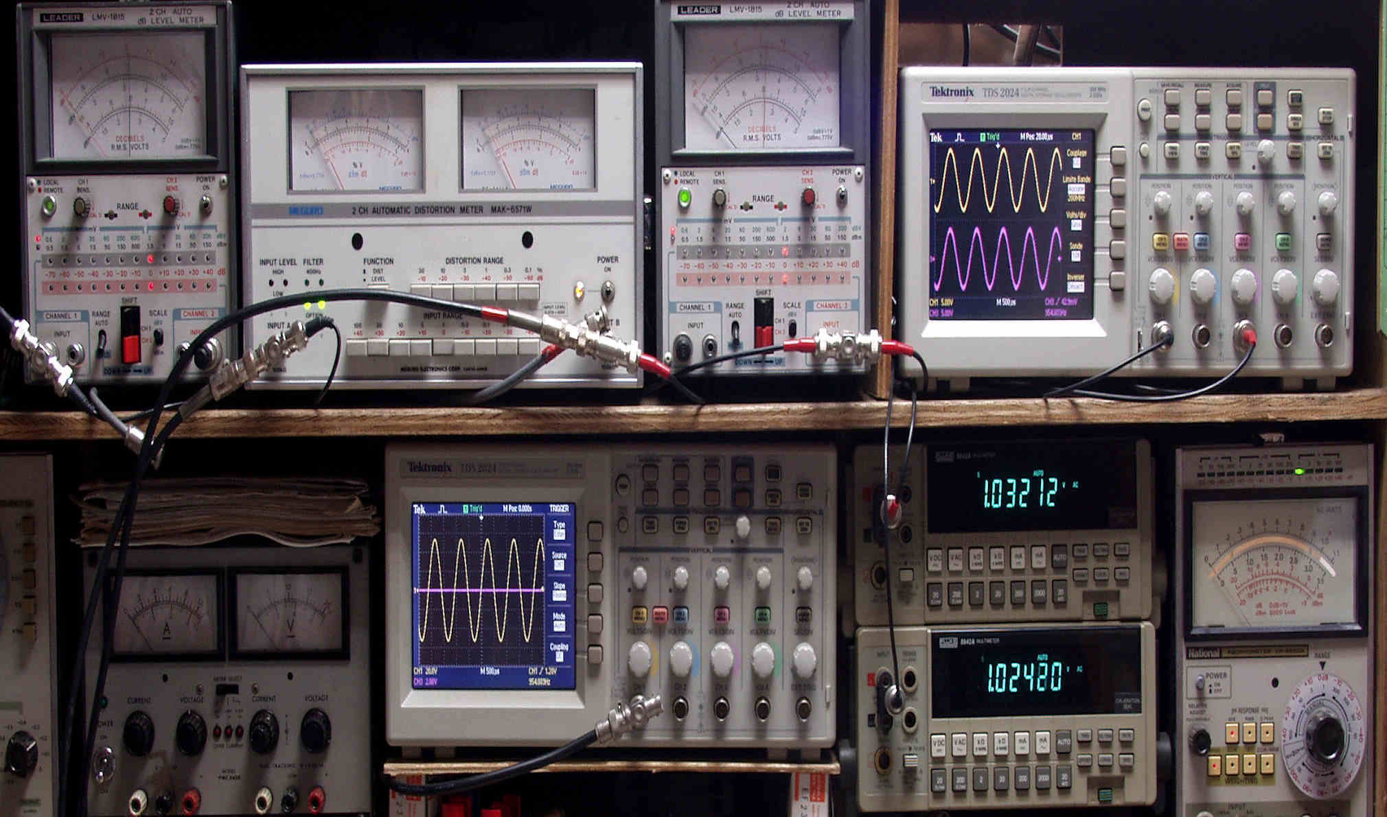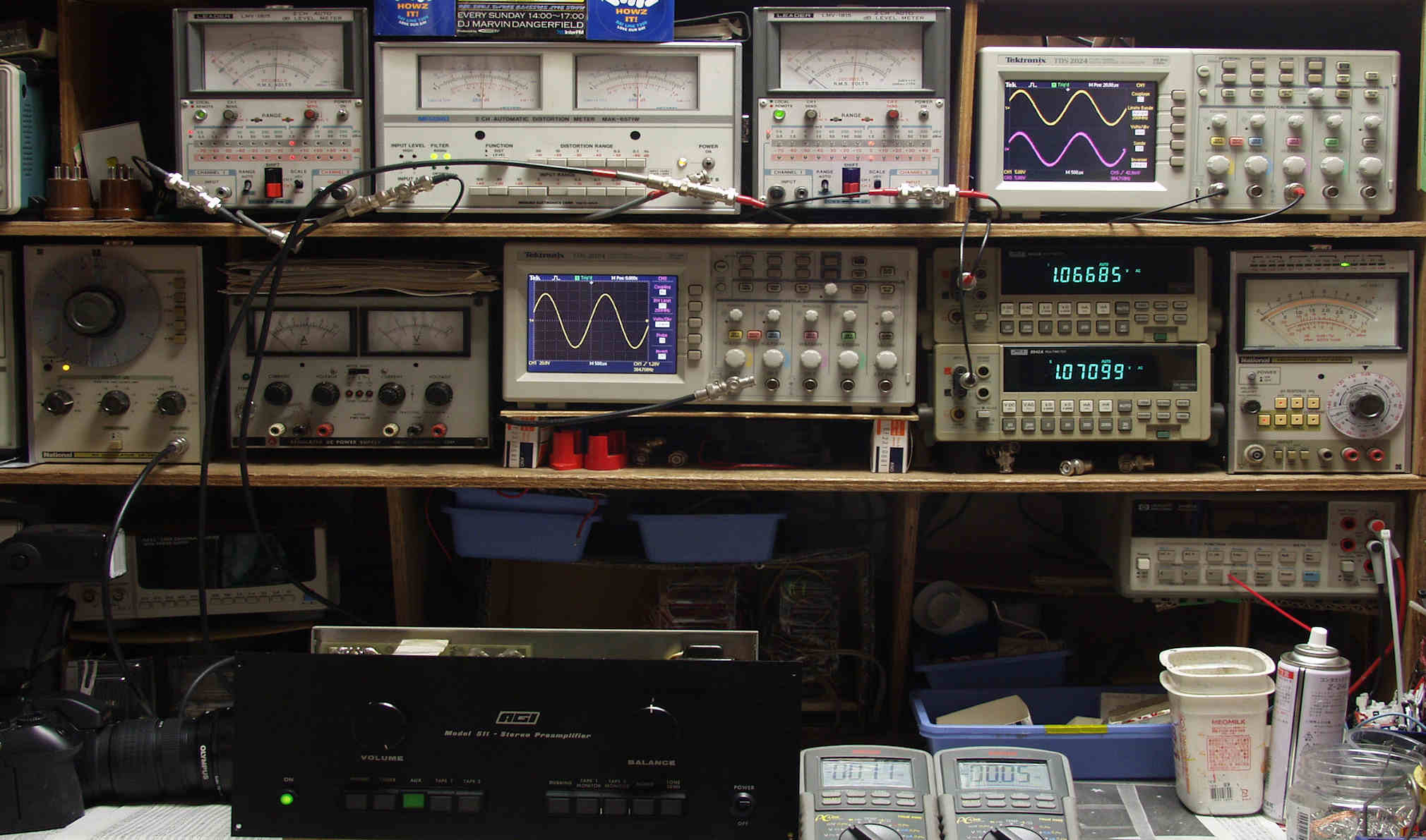 | E. 調整・測定。 画像をクリックすると、大きく(横幅2050ドット)表示されます。 E1. 出力/歪み率測定・調整 「見方」。 下段左端 オーディオ発振器より400HZ・1KHZの信号を出し(歪み率=約0.003%)これをAMPに入力し、出力を測定。 下段中央 オシロ=入力波形(オーディオ発振器のTTLレベル表示)。 上段左端 交流電圧計=L側出力電圧測定、黒針のみ使用。 上段中左 歪み率計=出力の歪み率測定 左メータ=L出力、右メータ=R出力。 上段中右 交流電圧計=R側出力電圧測定、赤針のみ使用。 上段右端 オシロ=出力波形表示、 赤表示=R出力、黄色表示=L出力。(実際にはRL交流電圧計の出力「Max1V」を観測)。 下段中右上 デジタル電圧計=R出力電圧測定。 下段中右下 デジタル電圧計=L出力電圧測定。 |
