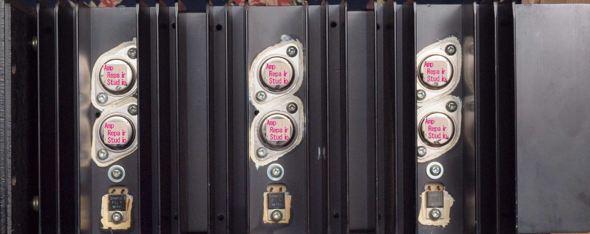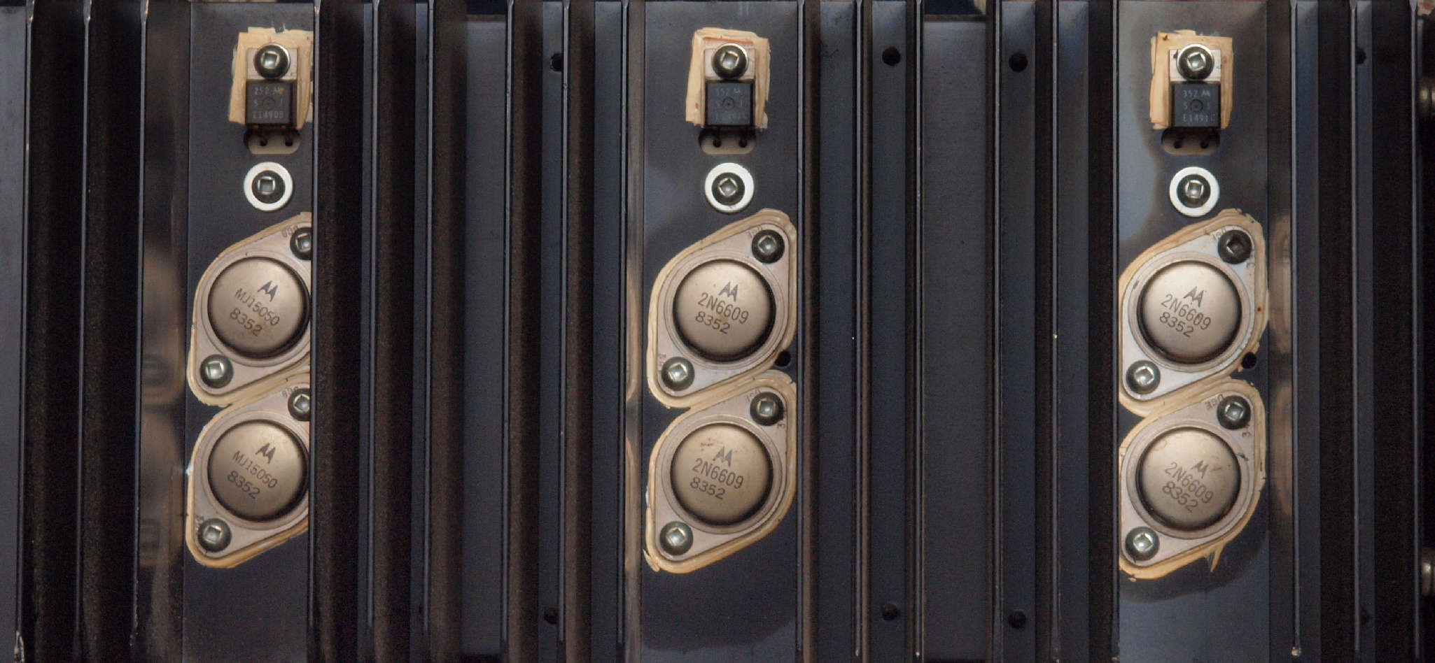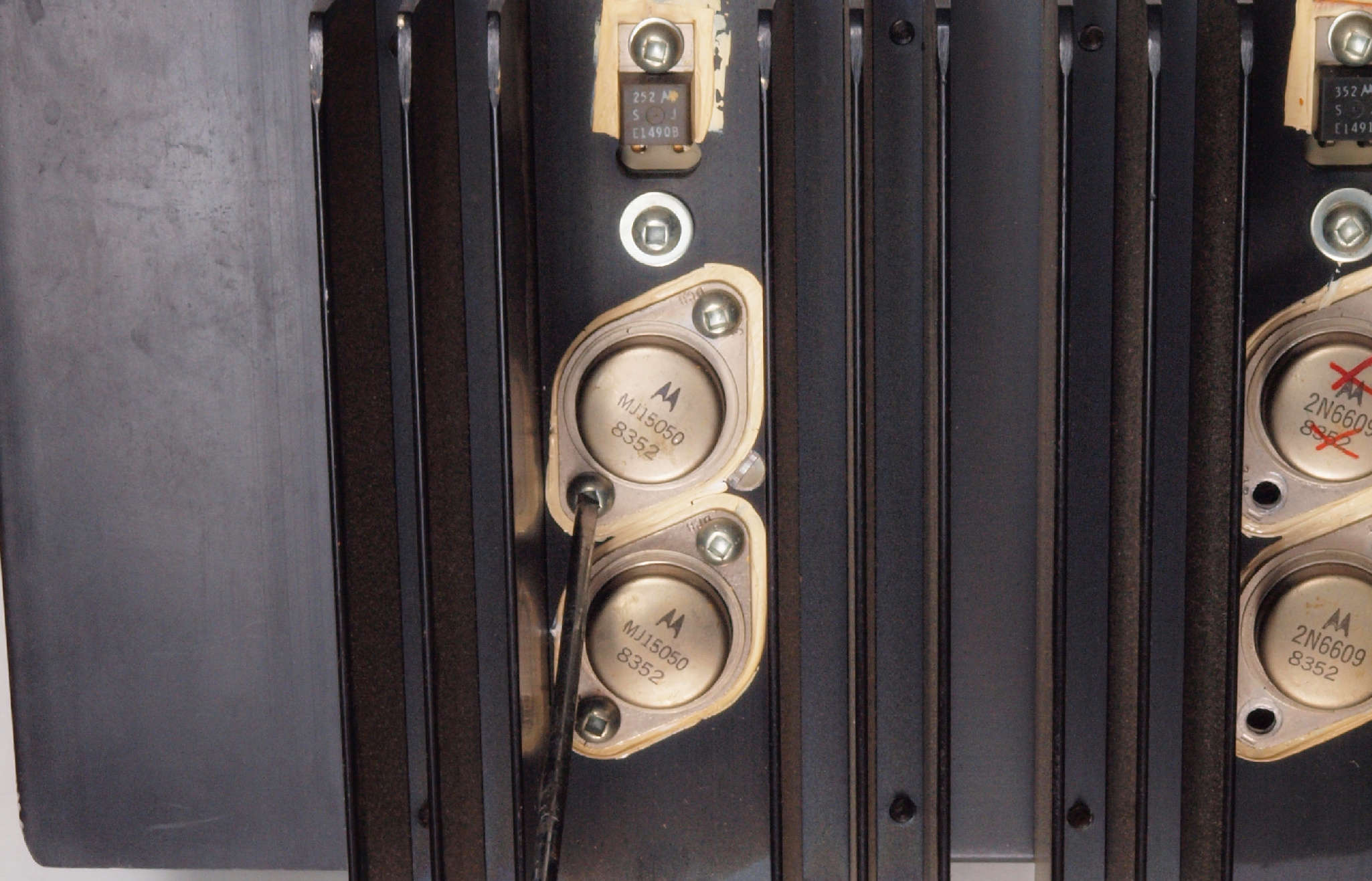 | A51. 点検中 R側終段TR(トランジスター)。 OEMの「MB6521、MB6522」、 モトローラーの汎用品の「2N6609」、ONSEMの「MJ15050」の混在。 |